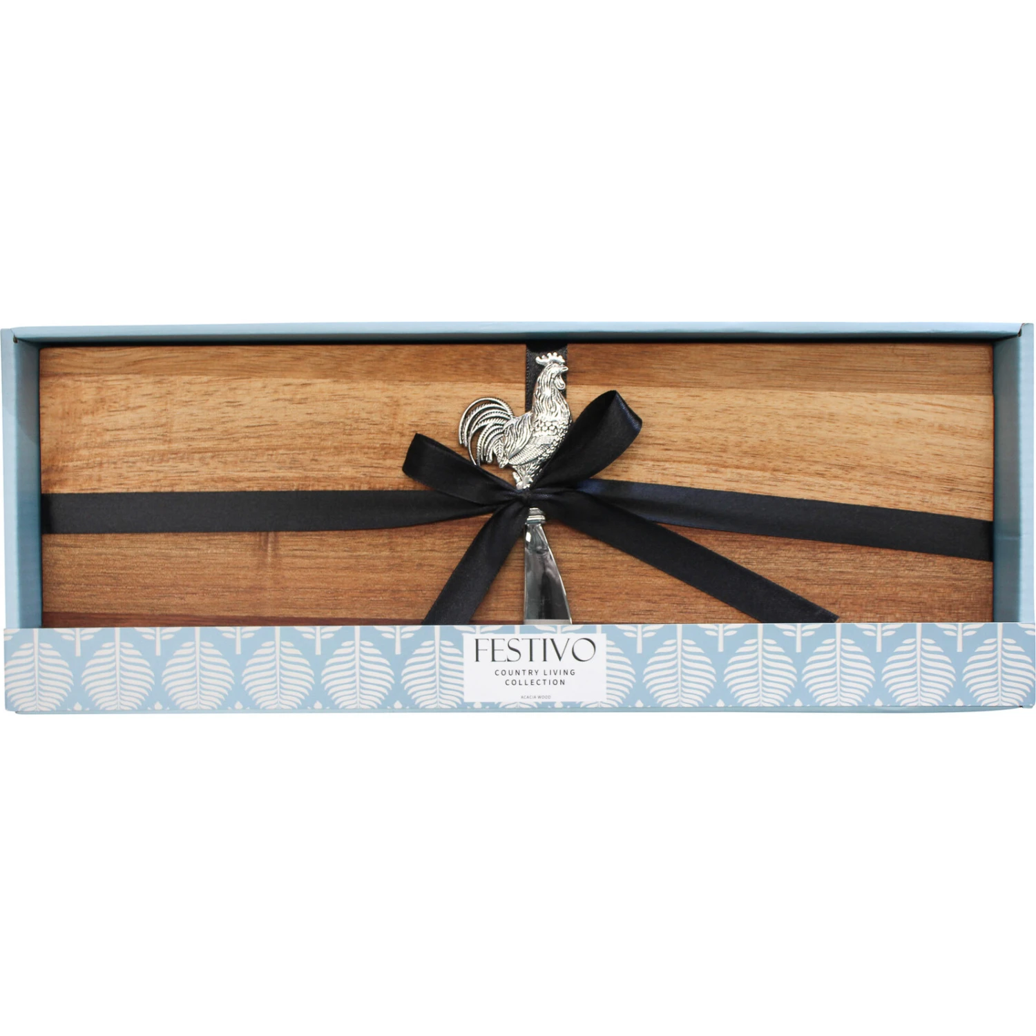 Characterized by a light brown hue, acacia wood, rectangular shape, and roosters-inspired spreader. Our kitchenware set excels in providing comfort and appeals to the eyes. This board can safely be used for preparing and serving food.
