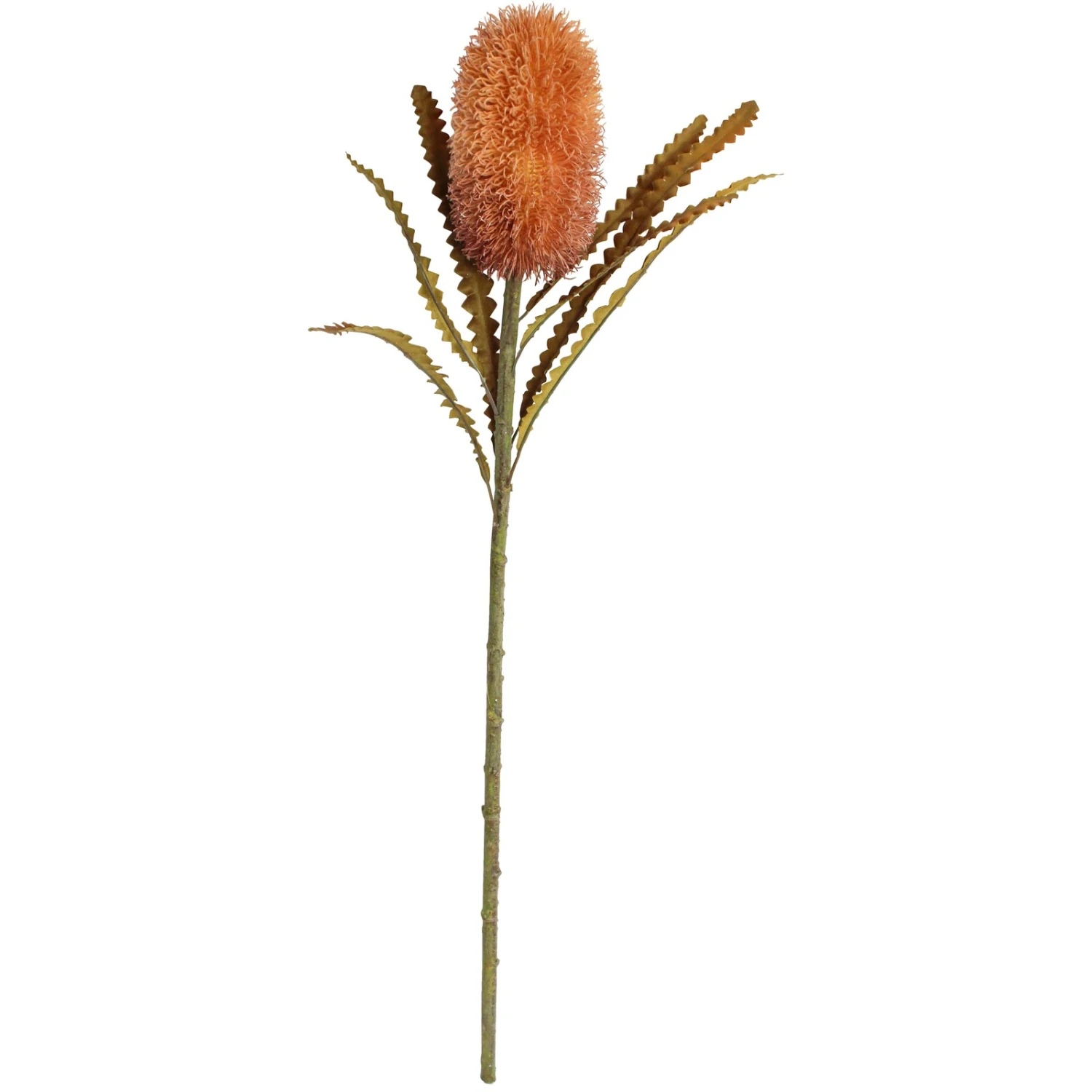 Capture the natural beauty of the Australian landscape with the Banksia Stem Amber, a striking faux floral accent perfect for any home or office decor arrangement. Standing at an impressive 60cm, this durable plastic and wire replica boasts a vibrant amber hue that adds a warm, inviting touch to any space. With its lifelike appearance and maintenance-free allure, this banksia stem offers retailers a chance to entice customers seeking long-lasting and exotic botanical elements for their interiors.