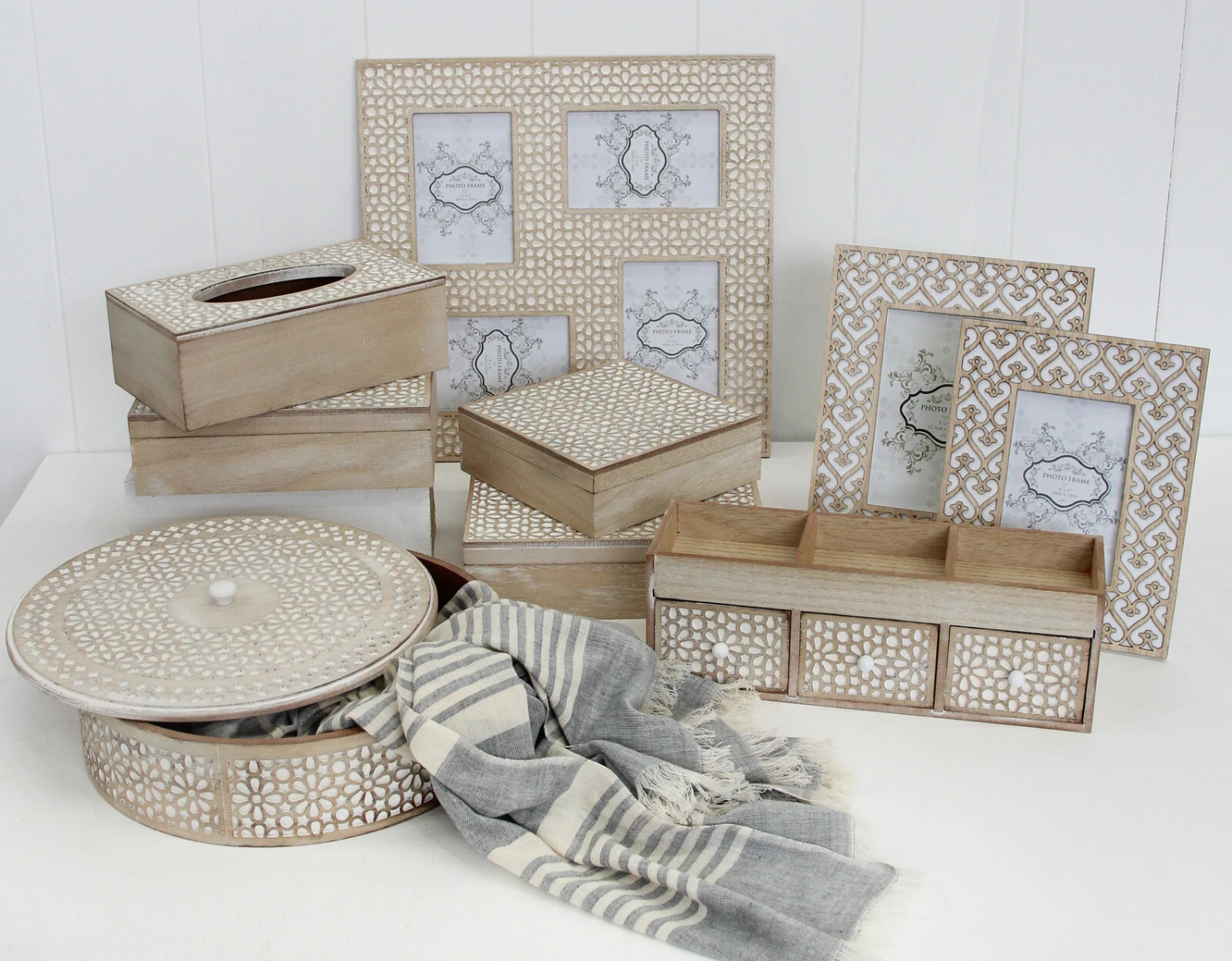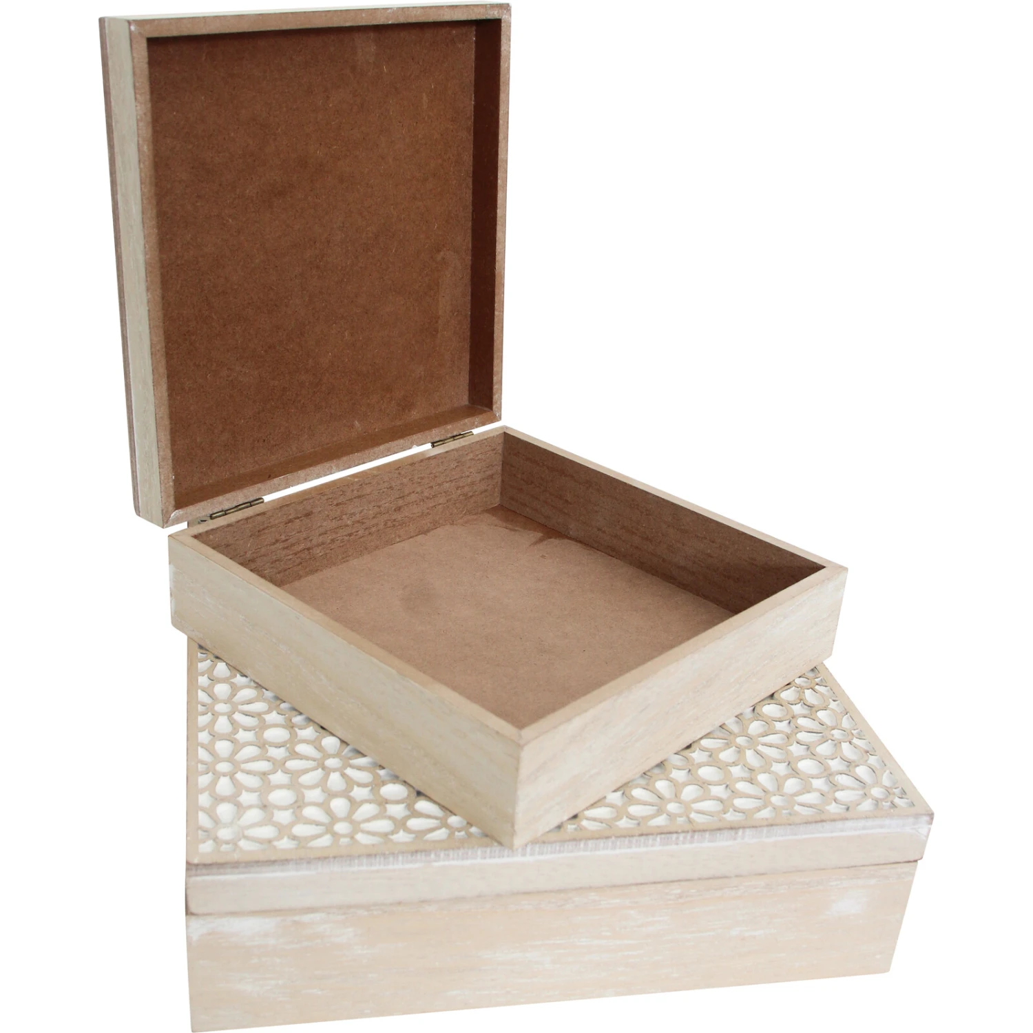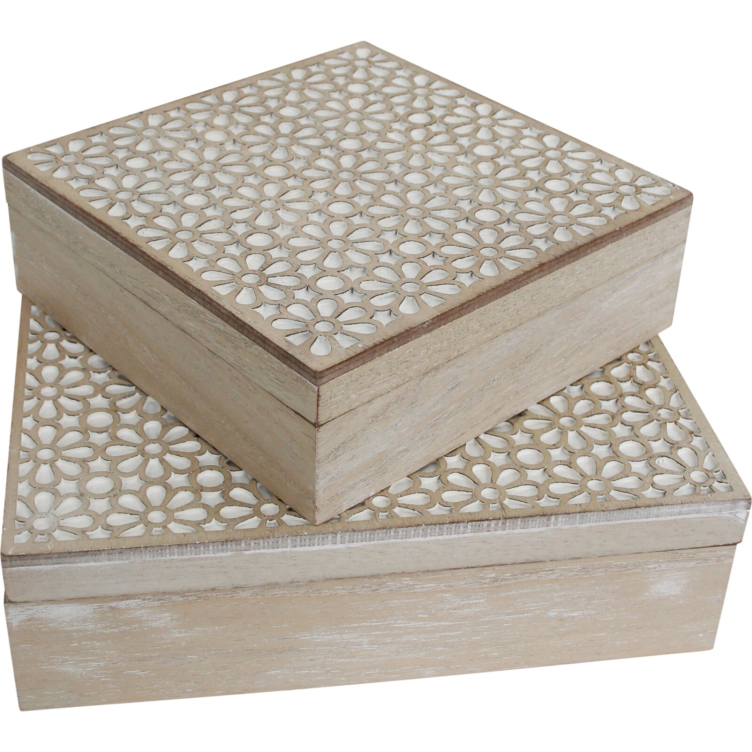 The Boxes Daisy S/2 is a set of two similarly shaped and designed boxes but both of which are made in differing sizes of large and small. Both boxes are crafted using premium quality medium density fibreboard material with the top of each box artfully ornamented in sunflower shaped patterns. Apart from this, this patterned portion of the box is further decorated with white washed lacquered finish.