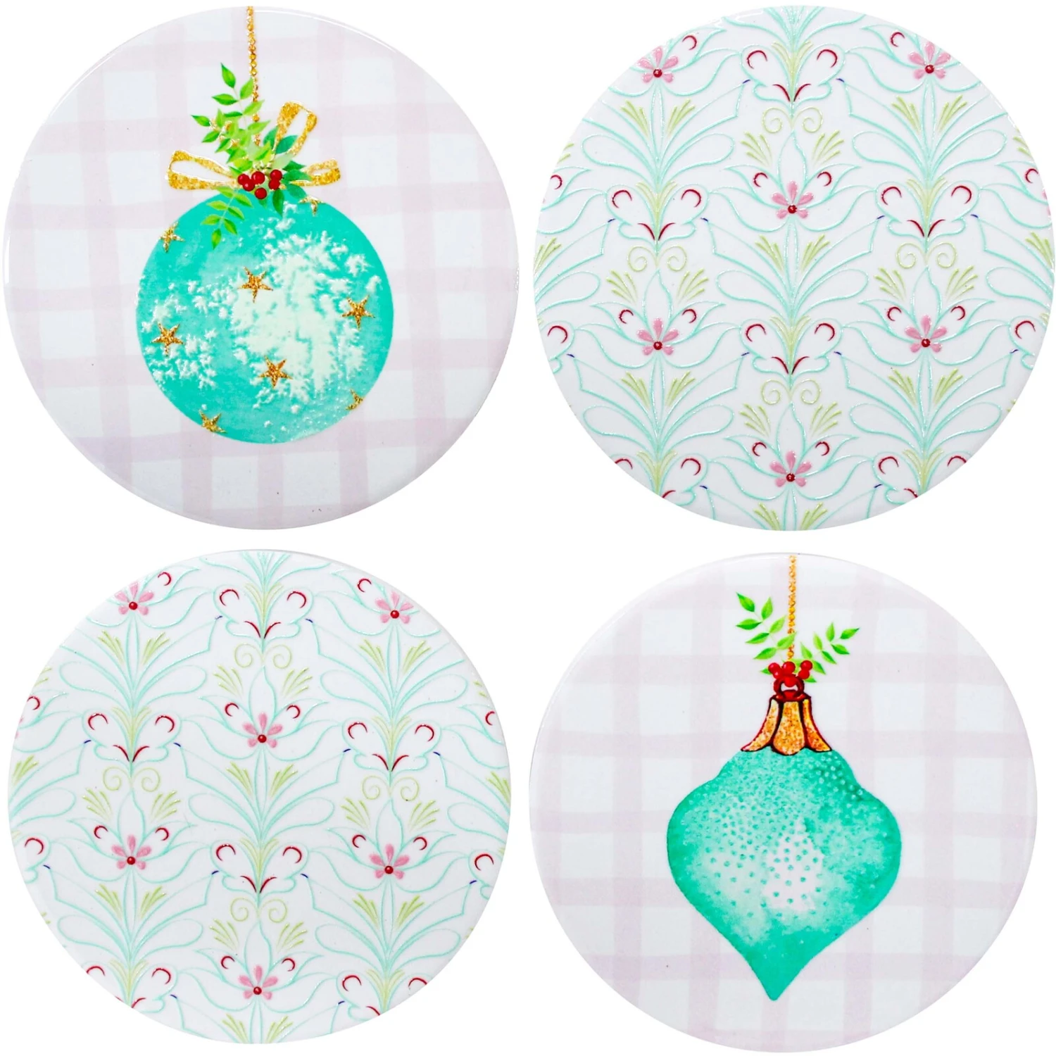 The Aqua bauble coasters are around in shape and come in a set of 4. They have been crafted from ceramic which provides great protection from moisture is heat. Add to the festive cheer and builds the Ambience for the festivities to come. Can be added to the dinner table, or the coffee table and even your work desk. Colourful and bright, the print on the top surface will retain its brightness despite repeated you such and cleaning.