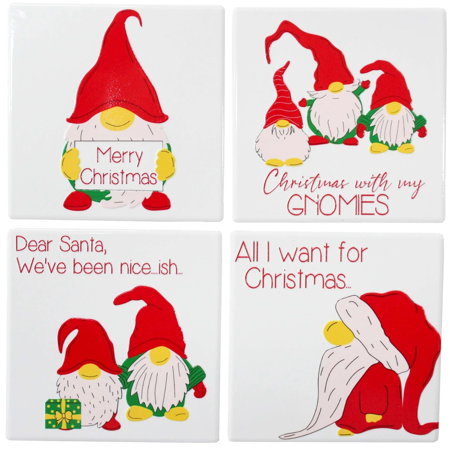 This set of Christmas themed coasters bring brightness and cheerfulness all at once. gnomes and Santa figure majorly in the messages while the colour red splashes across all four ceramic coasters. Made from a sturdy material, it’s going to Brighten up your countertops and table tops ensuring that no spillages or hot steaming dishes will tarnish the Shine.