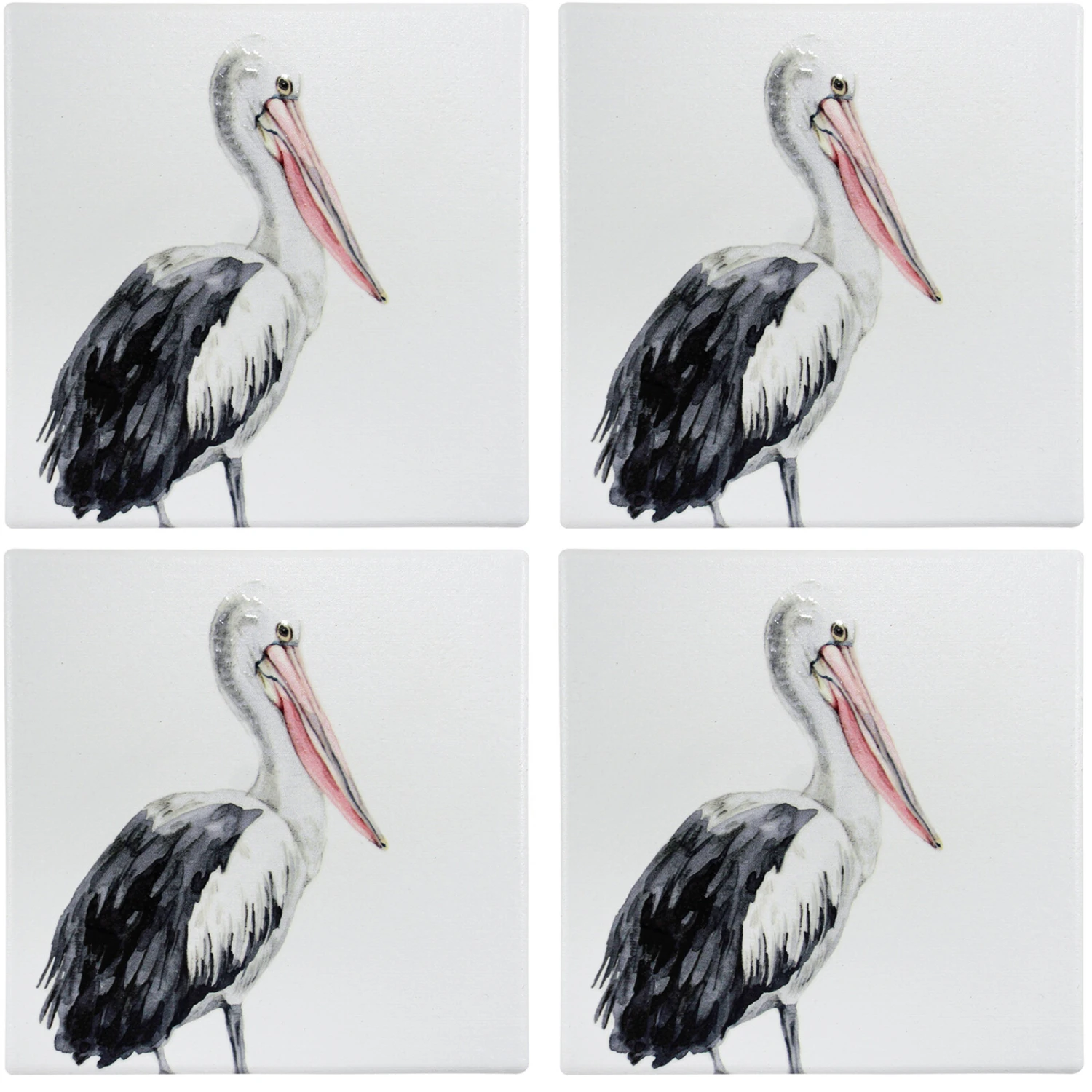 Make this magnificent quirky creature a regular view in your every day with these pelican-inspired coasters. Characterized by a heavy body, long beak, elongated neck, and large throat pouch. This ornamental piece features a black pelican bird with satisfying white strokes against a plain white background.