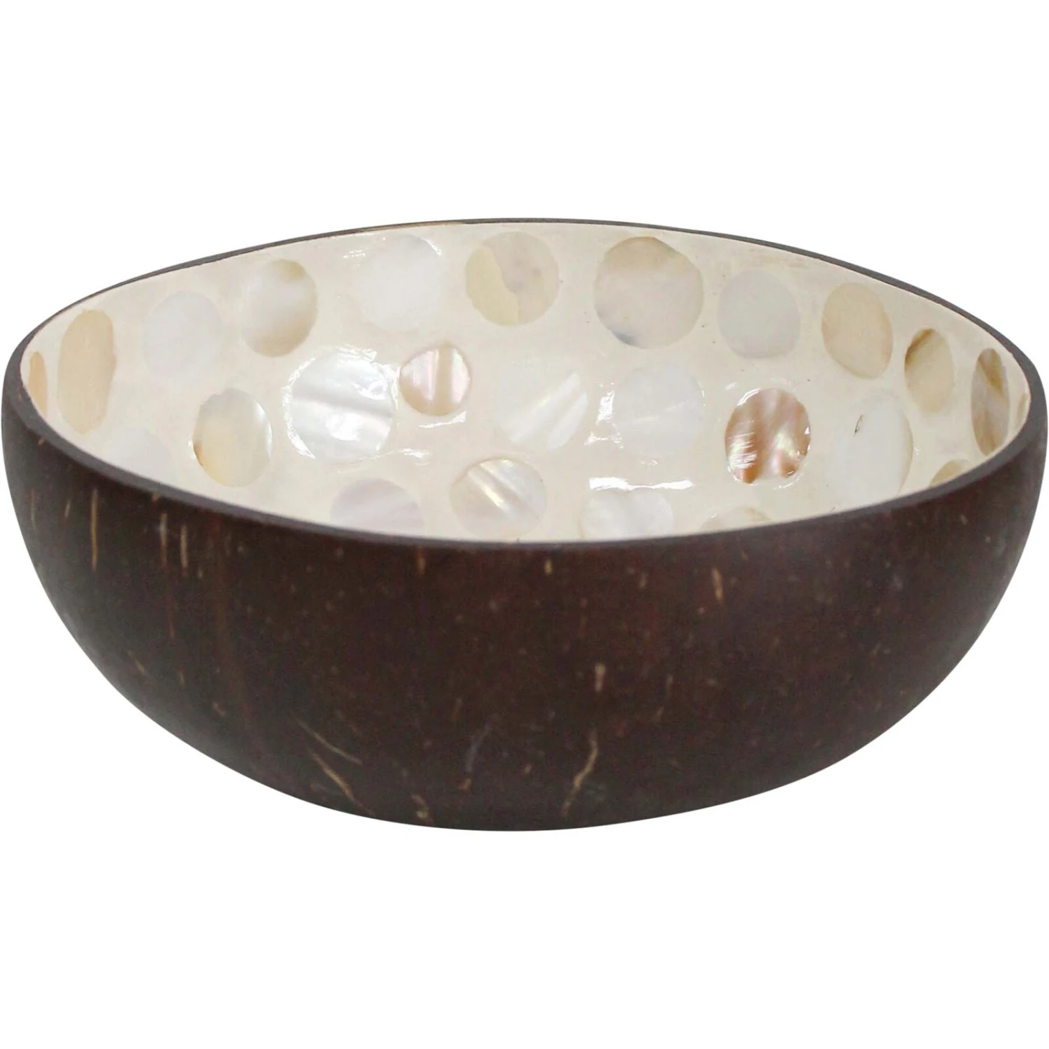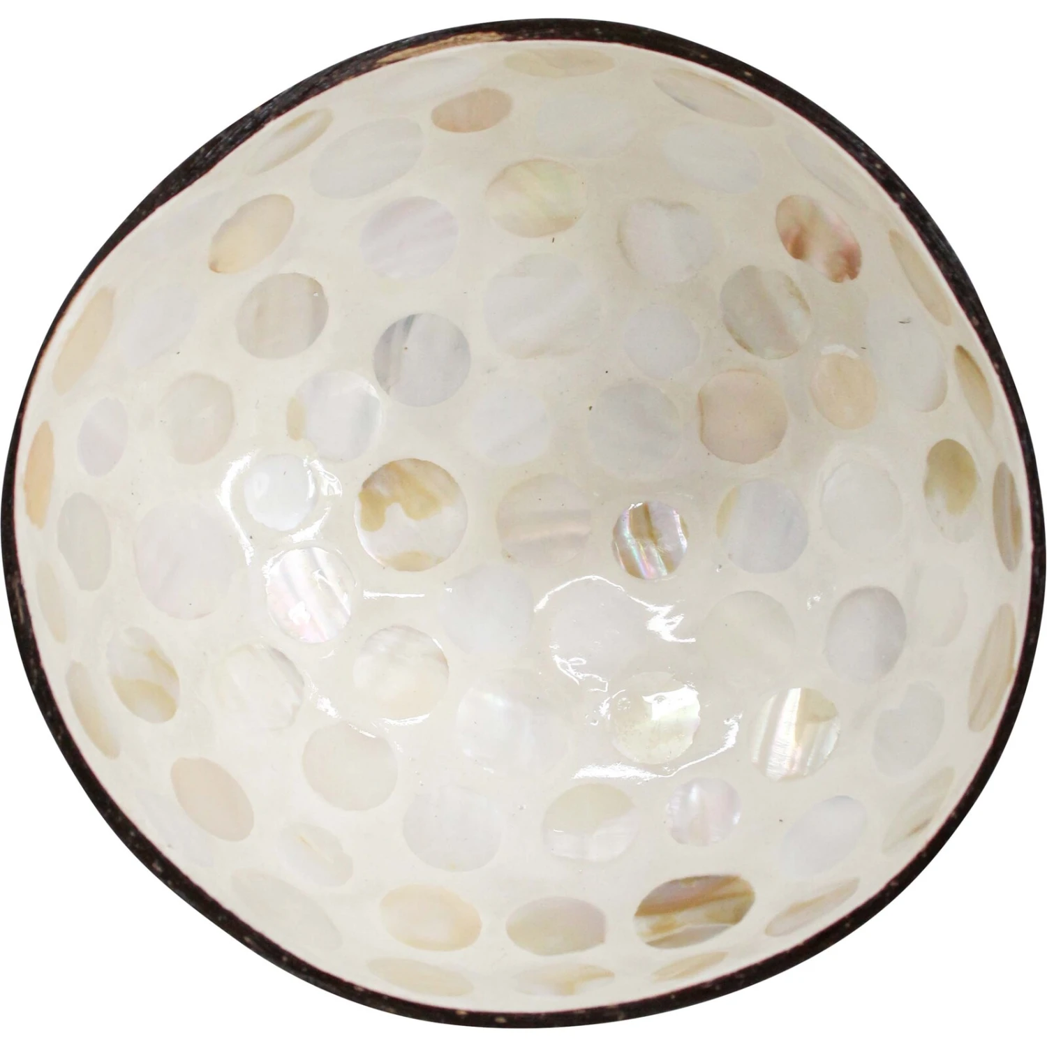 Elevate your home decor with the Coco Bowl Ivory Dot, a stunning synthesis of natural beauty and artisanal craftsmanship. This exquisite piece, measuring approximately 13x13x6cm, boasts an organic coconut shell exterior paired with a radiant mother-of-pearl inlay, creating a mesmerizing pattern that captures the eye. Ideal for discerning customers seeking environmentally friendly and unique design elements, this bowl promises to be a fast-selling item that adds a touch of elegance to any retail collection.