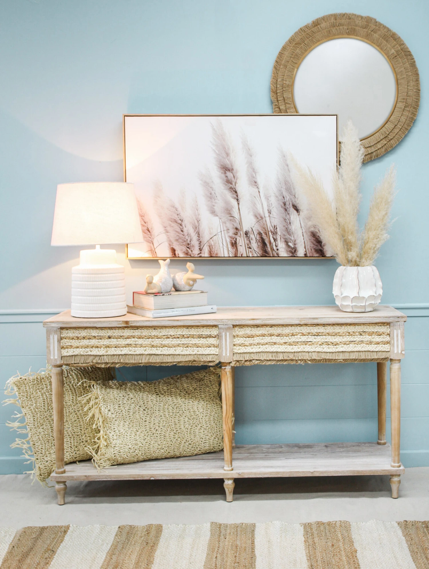 The Console Lrg Boho Plait is a large, horizontally inclined console that gives your customers double opportunity to decorate their spaces while getting to utilise as many decorative edifice as they would like. It also grants them the opportunity of being able to arrange their modern, cutting-edge electronic gadgets with a tinge of rustic whitewashed ornamental complementary look.