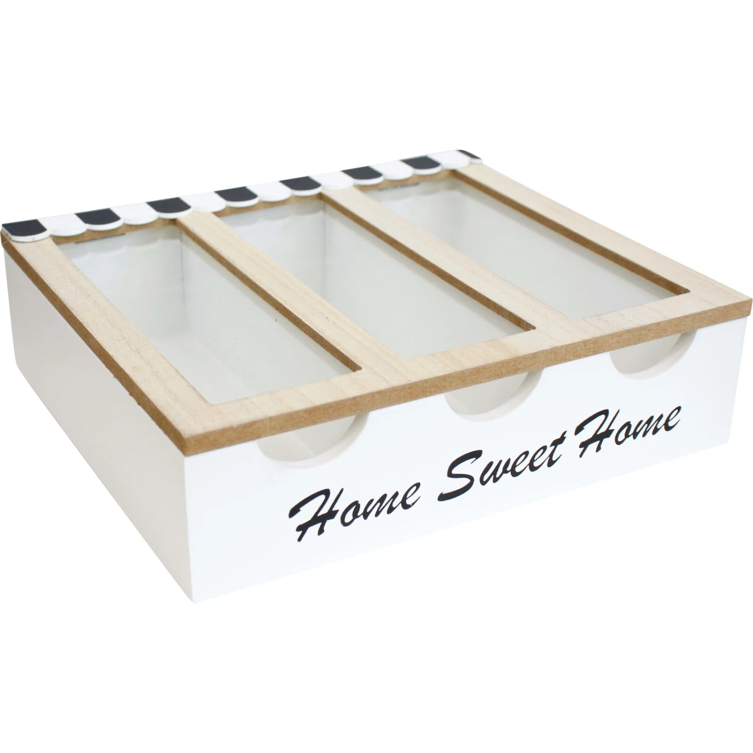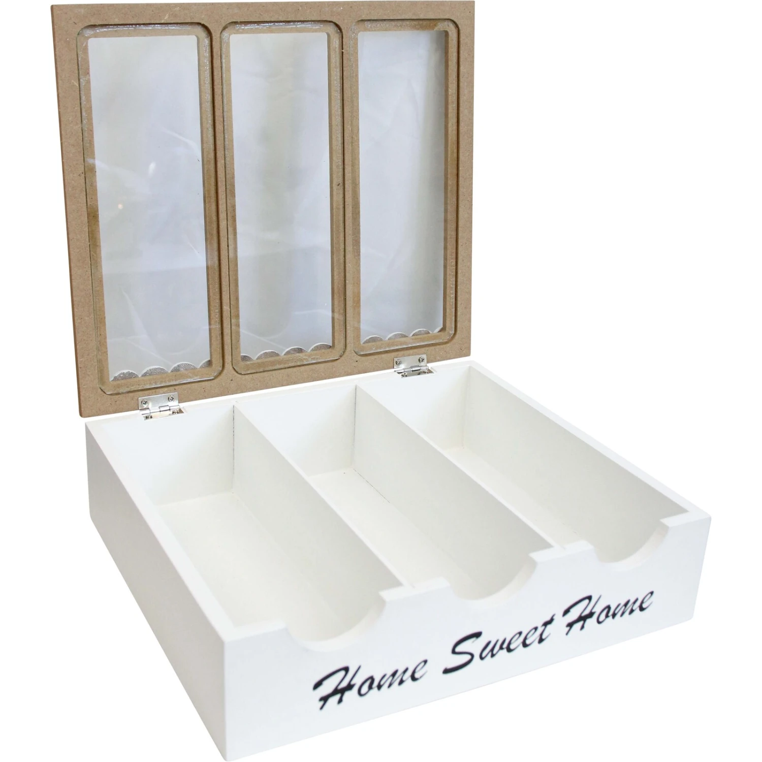 A delightful triple compartment storage created for your everyday cutlery needs. Made from solid MDF, it has been given a wash in white colour. The lid is made of glass which allows you a peep into the contents. Great for keeping your everyday use spoons, knives and forks. You will love its rustic chic styling in white and black. A displayable chest that has an old world charm in its design.