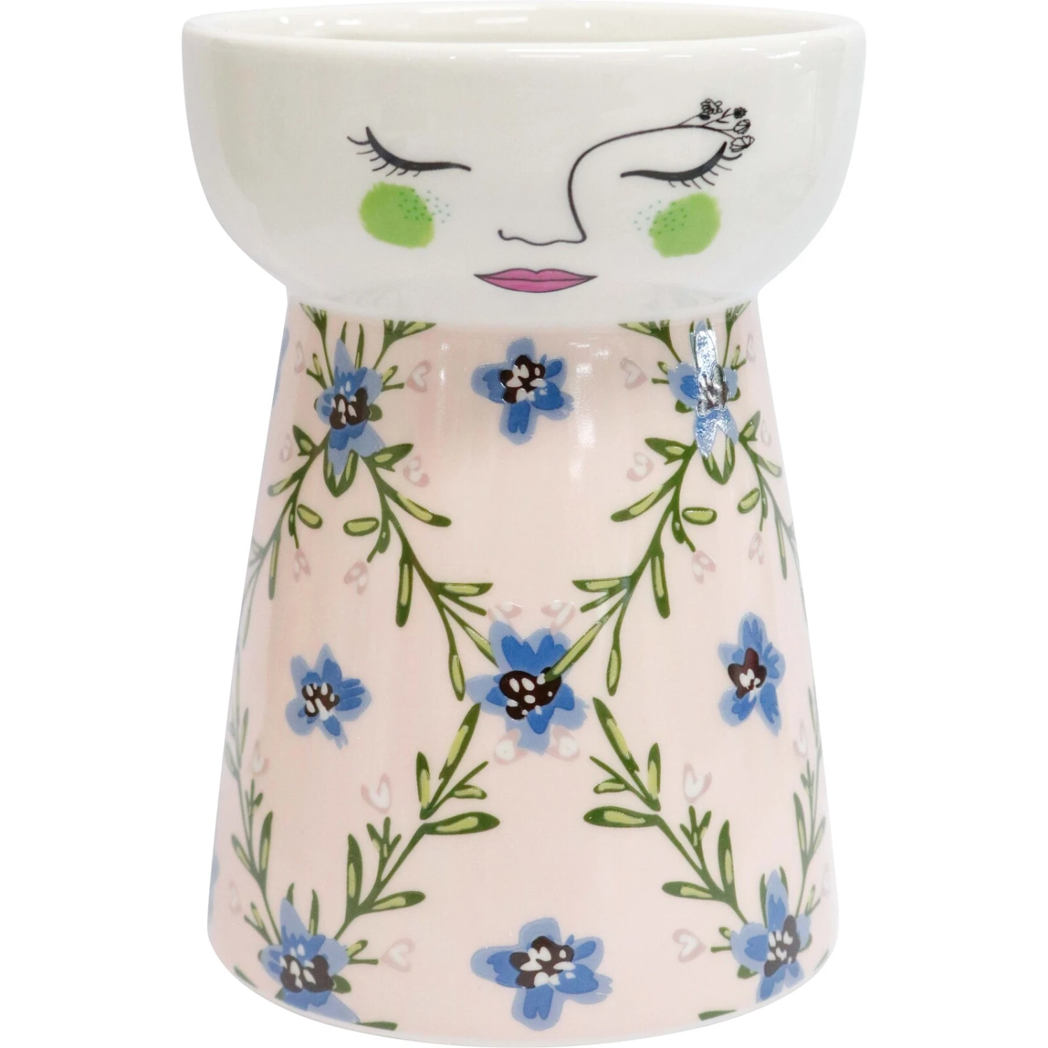 Add a touch of whimsical elegance to any space with the Doll Vase Rosemary Heart, a charming ceramic accent piece that measures 11.5×11.5×16.1cm. Its delightful design features a serene facial illustration and a pattern of dainty blue heart-shaped flowers, set against a gentle pink background, making it an ideal decorative item for those looking to infuse their homes with a playful yet graceful vibe. Retailers can captivate shoppers seeking unique, eye-catching home décor by showcasing this enchanting blend of artistry and functionality.