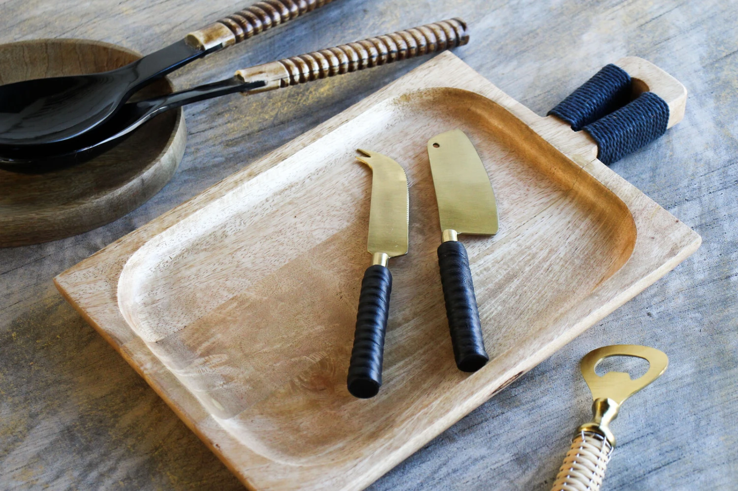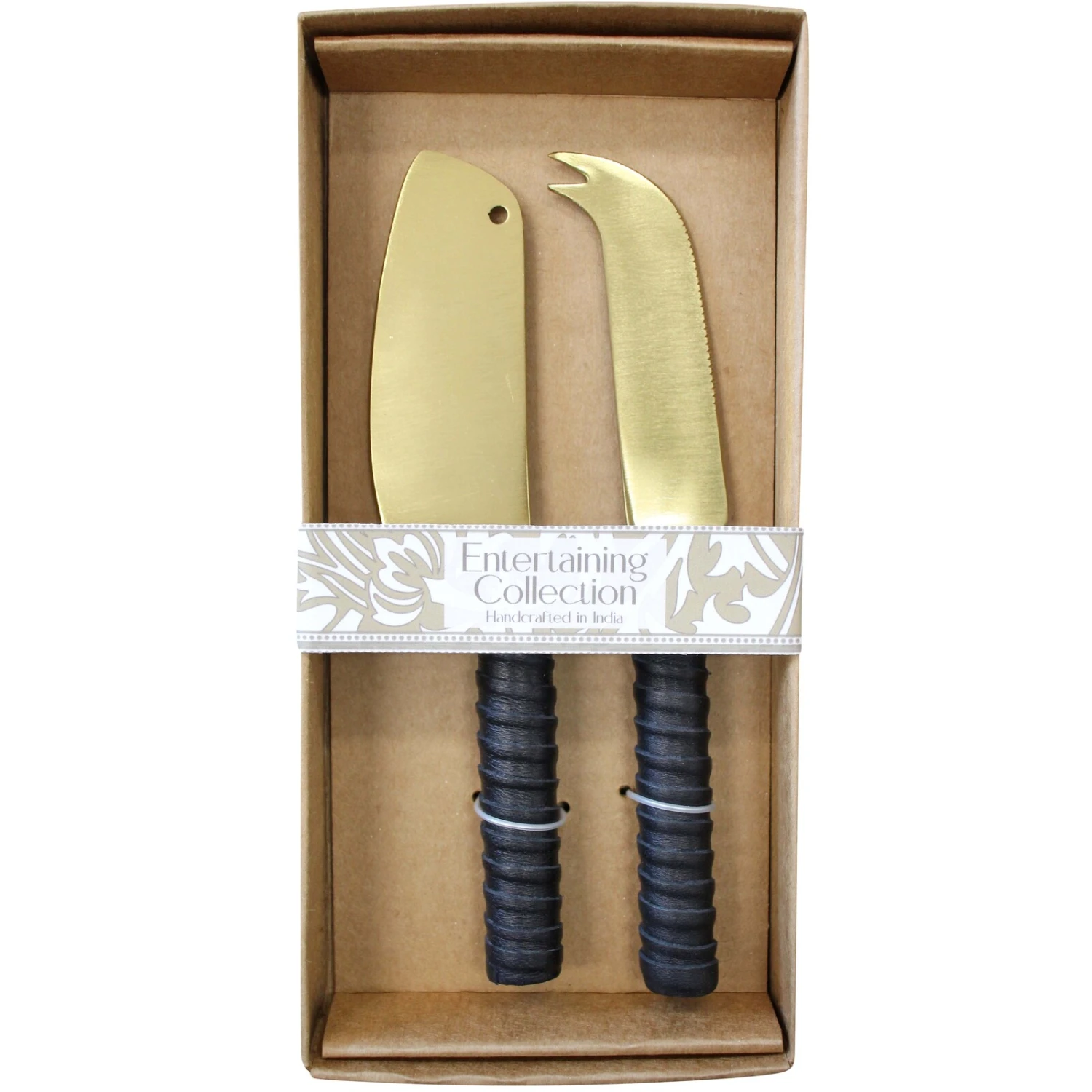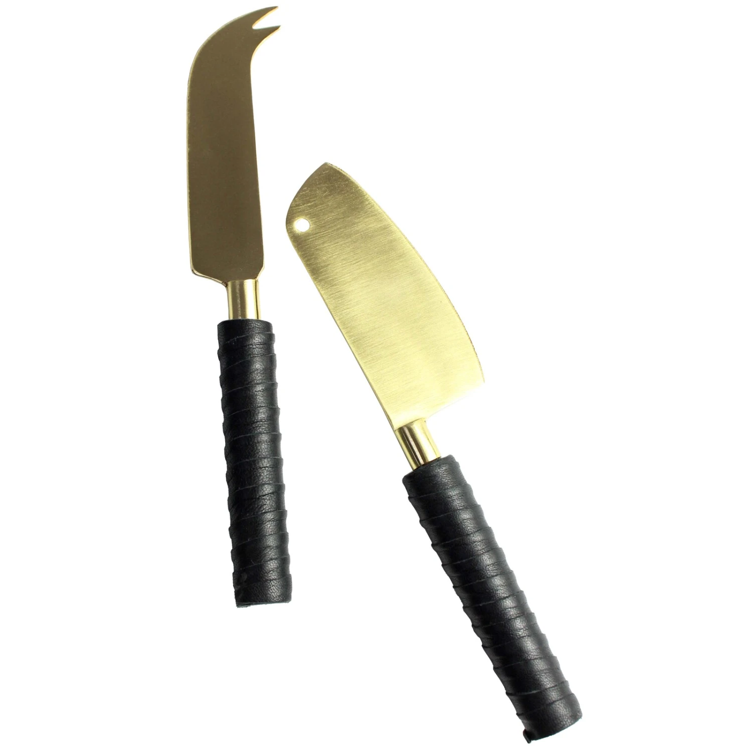 Introducing our stylish set of two cheese knives in gold hue. These elegant brass knives feature a luxurious leather handle, wrapped in black for a touch of sophistication. Not only do they add aesthetic appeal to any dining experience, but they are also crafted to be durable and long-lasting, ensuring they will be a staple in the kitchen for years to come.