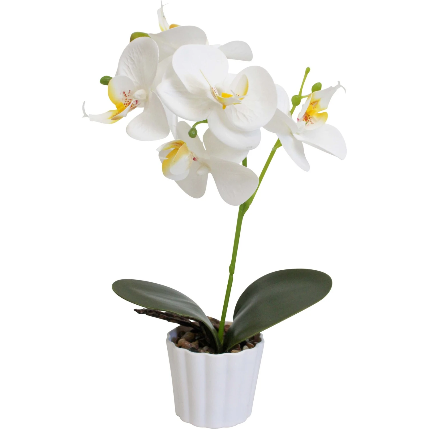 This stunning Faux Orchid in White is the perfect addition to any home or office space. With its delicate petals and realistic green leaves, it adds a touch of elegance to any room. Measuring at a small size, this artificial orchid is ideal for tabletops, desks, or shelves. Its white colour makes it versatile and easy to match with any décor. The faux orchid requires no maintenance, so you can enjoy its beauty all year round without any hassle. Add a touch of sophistication to your space with this beautiful and lifelike Faux Orchid.