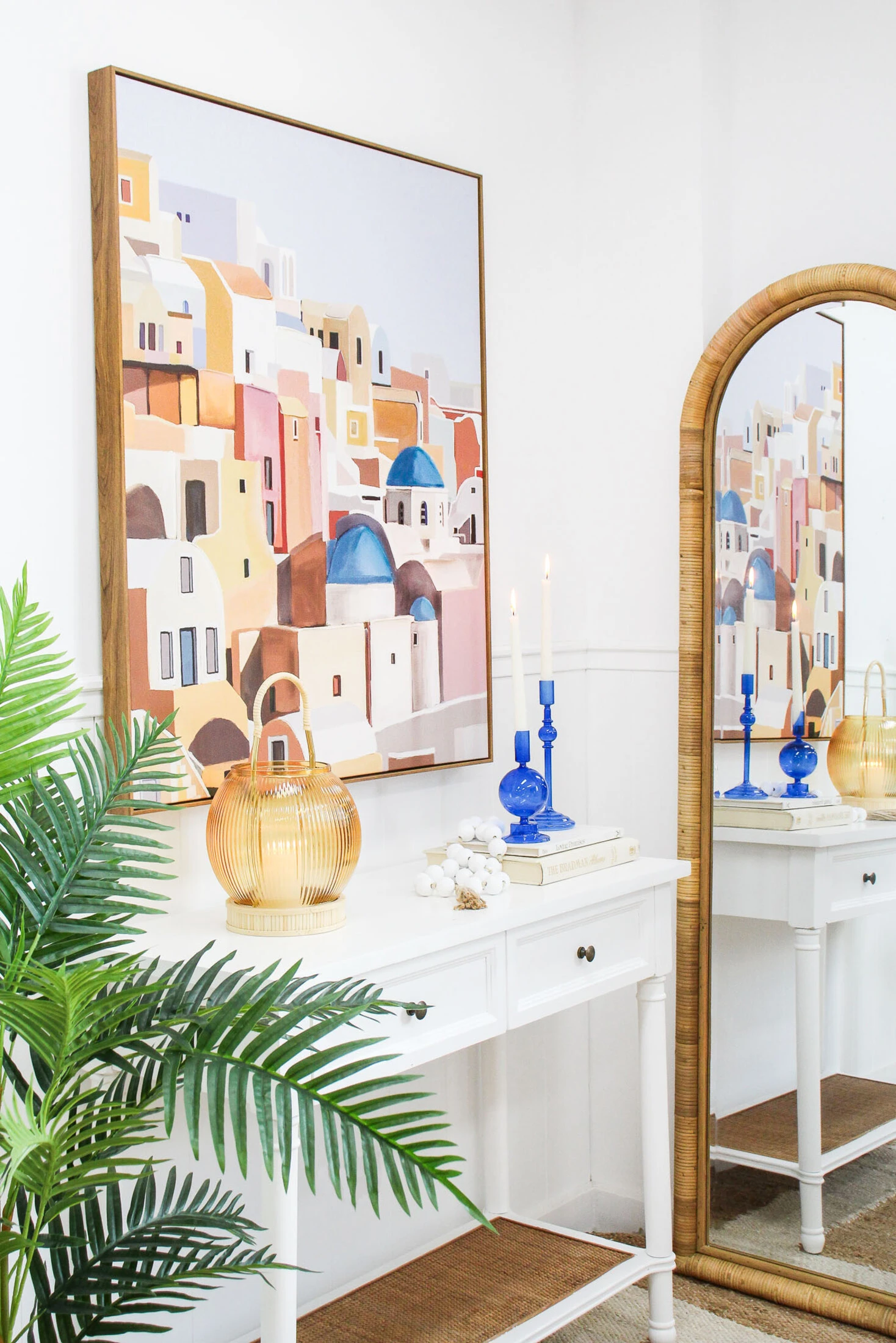 Add a touch of serene Mediterranean charm to your decor with the Framed Canvas Mediterranean, measuring a generous 80x100cm. This piece boasts a sturdy pine frame and a high-quality canvas coated with resilient resin, ensuring long-lasting beauty and vibrance. The painting’s soothing palette and iconic blue domes will surely captivate your customers, inviting dreams of distant shores and adding a sophisticated global flair to any collection.
