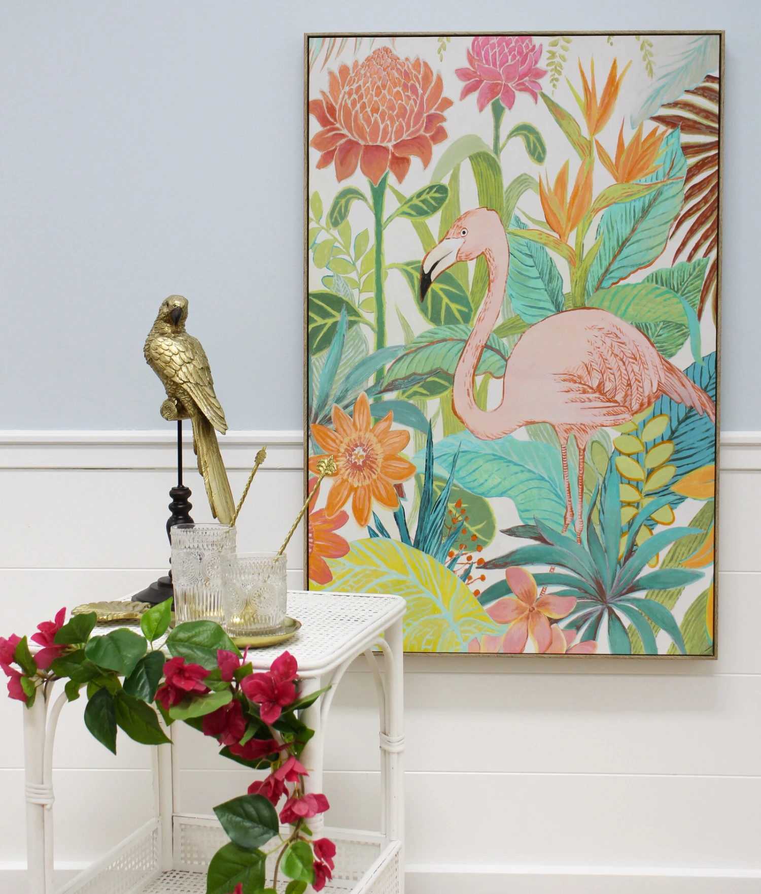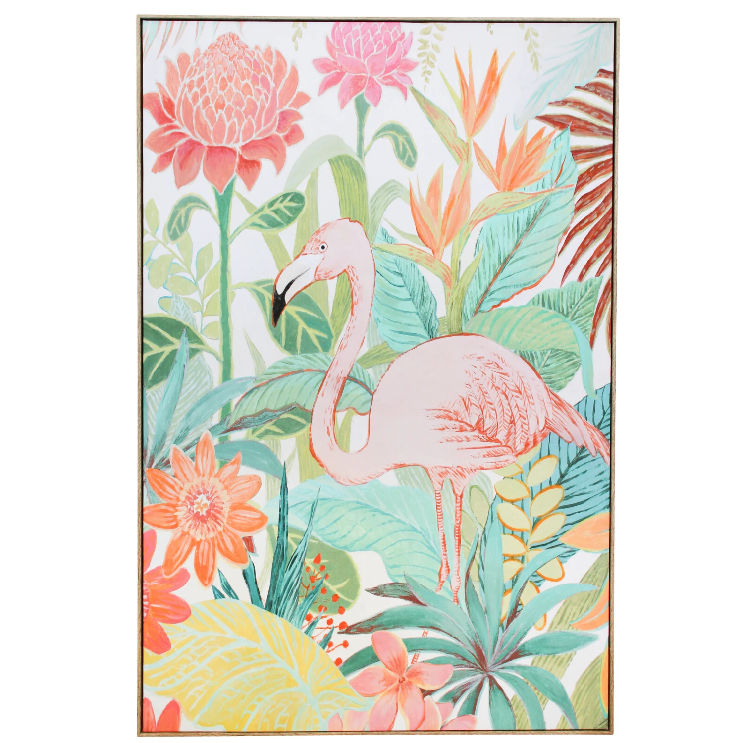 The Framed Canvas Tropic Life has a stunning aesthetic appeal that would be perfect for use in breathing new life into every spatial décor that your customers may intend to create or may have already created. This painted canvas artwork features the depiction of a tropical forest whilst giving a glimpse of the beauty present within our tropical rain forests. It showcases beautiful plants and a large bird.
