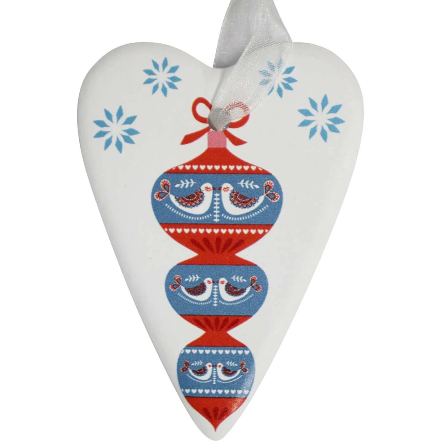 The Gift Heart Christmas Baubble is a sophisticated and eye-catching décor piece that consists of a beautifully crafted heart-shaped ceramic, delicately decorated with the vibrant imagery of three baubles stacked giving it an enchanting look and feel.