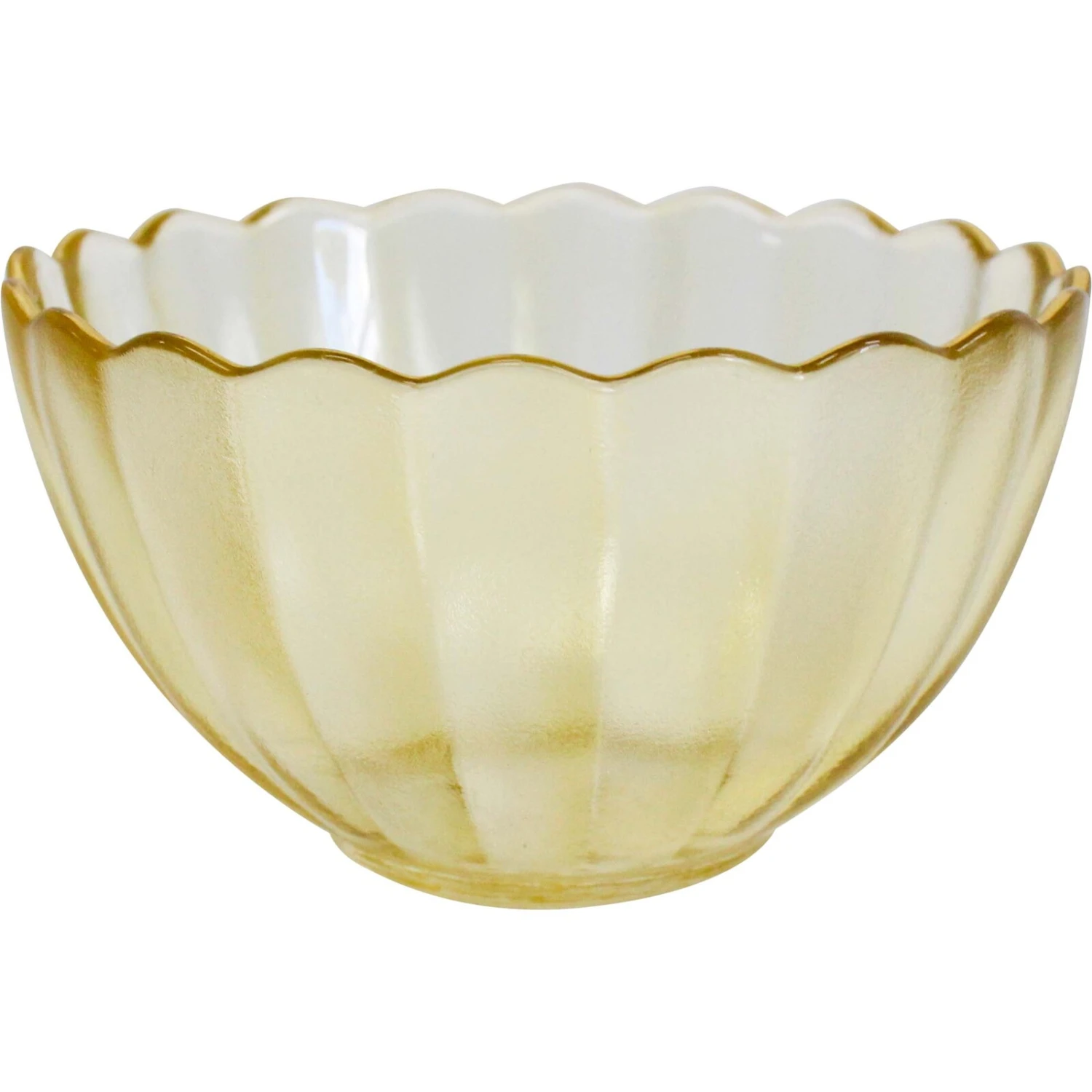 Glass Bowl Marrigold/Gold has a ribbed design, a glossy surface, and jagged edges. This magnificent bowl is a true masterpiece, precisely created to provide a touch of sophistication and luxury to any dinner table.