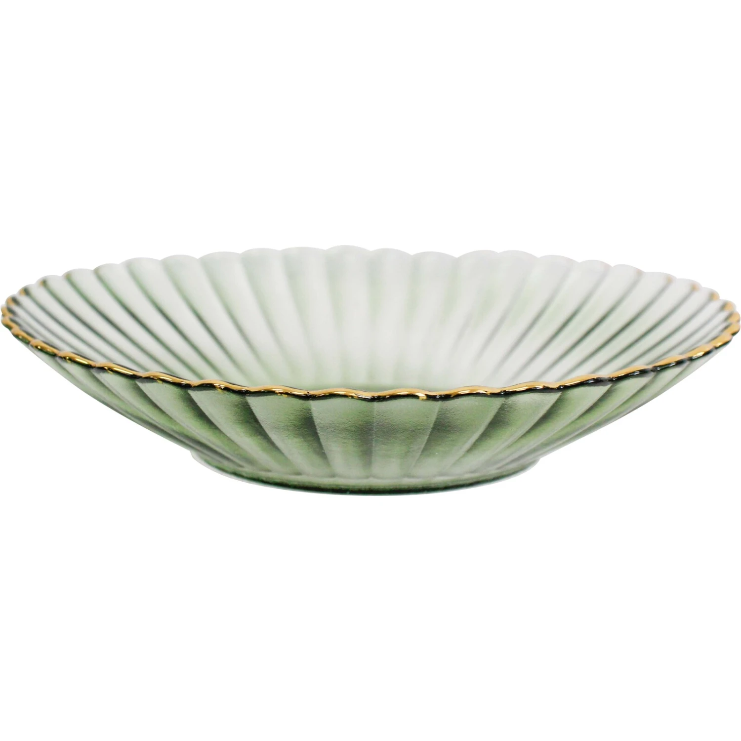 This glass dish is a must-have for any occasion. One can elevate their dining experience with our exquisite Glass Dish Moss/Gold. Featuring a ribbed design and golden tip that exudes luxury and sophistication. The jagged edge adds a unique flair, while the moss hue brings warmth to any table setting.