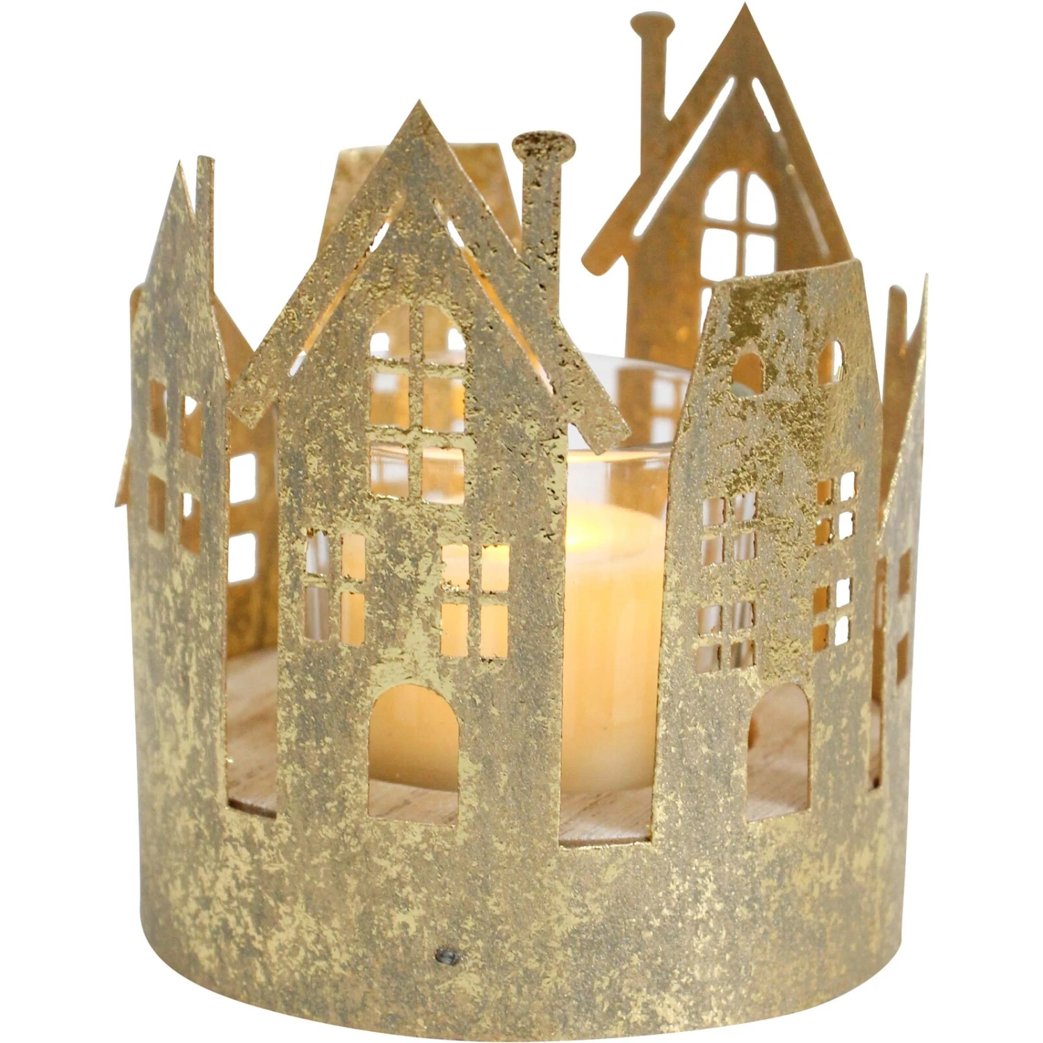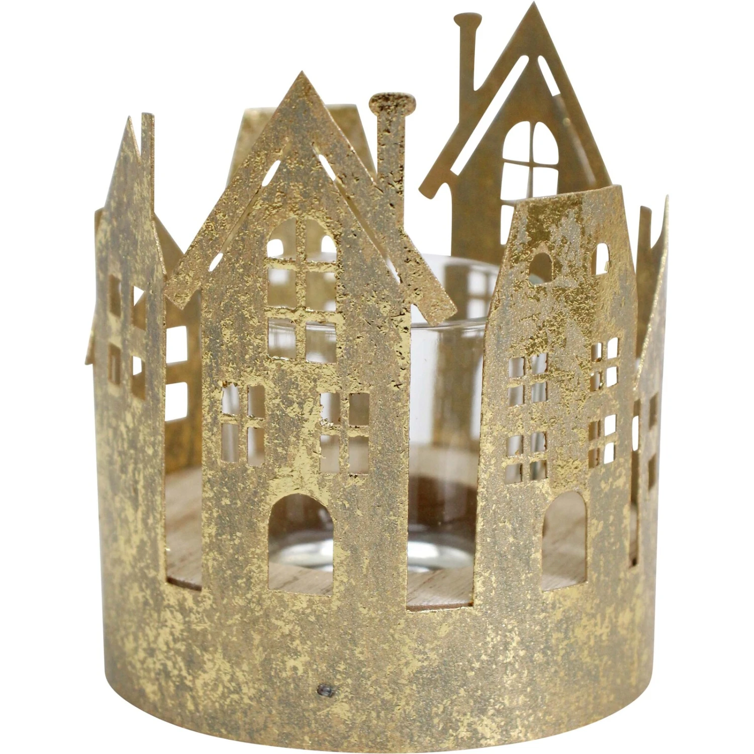 Gold Village Houses T/Light fearures miniature house silhouettes, each house uniquely shaped which adds a whimsical charm to its overall aesthetic. These houses are crafted from smooth, sleek metal, and their surfaces shimmer with a golden glitter, reminiscent of stardust.