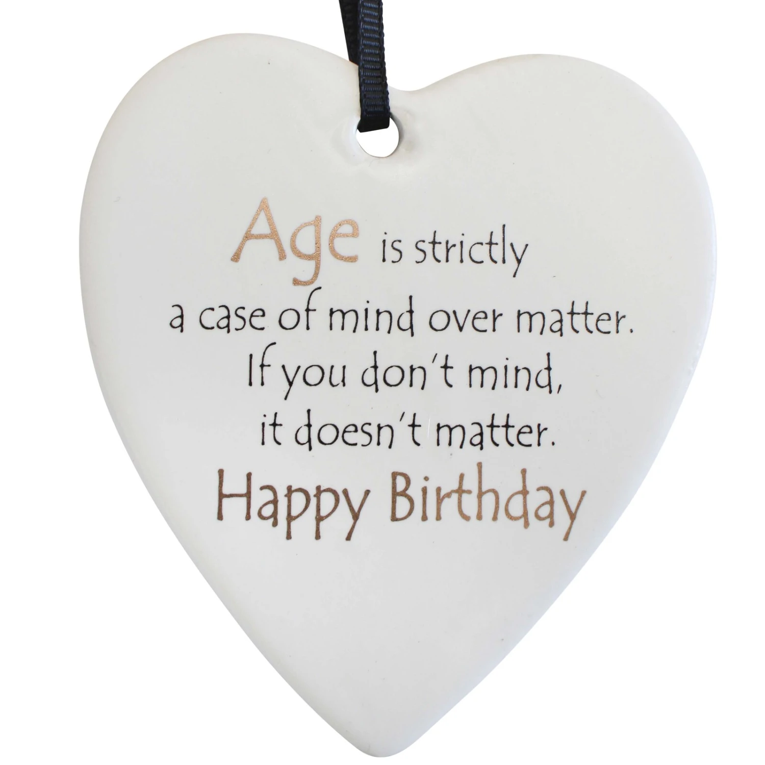 Celebrate the timeless nature of birthdays with the Hanging Heart Age Birthday keepsake, designed to delight with its playful and wise adage, “Age is strictly a case of mind over matter. If you don’t mind, it doesn’t matter.” Crafted from durable ceramic with a classic white finish and dimensions of 8x9cm plus a hanger for easy display, this charming heart-shaped ornament makes a thoughtful gift or a delightful addition to any birthday decor collection. The elegant script and neutral colour palette ensure it will complement any home style, enticing customers searching for a unique birthday memento.