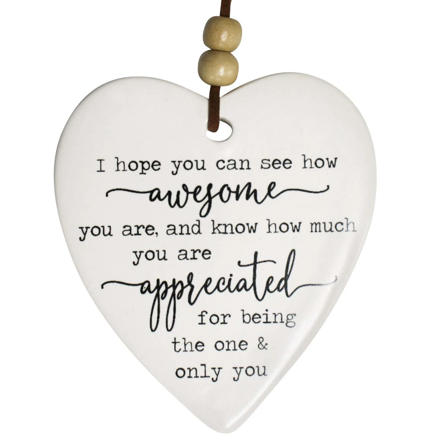 The Hanging Heart Appreciated ornament is a charming and heartfelt decorative piece, measuring an adorable 8x9cm plus hanger, crafted from high-quality ceramic to ensure durability and an elegant finish. Its crisp white colour accentuated by a heartfelt message in stylish black script makes it an ideal gift, bringing a personal touch to any space. Retailers will find this appealing item a perfect addition to their inventory for customers seeking meaningful and unique gifts that express appreciation and affection.