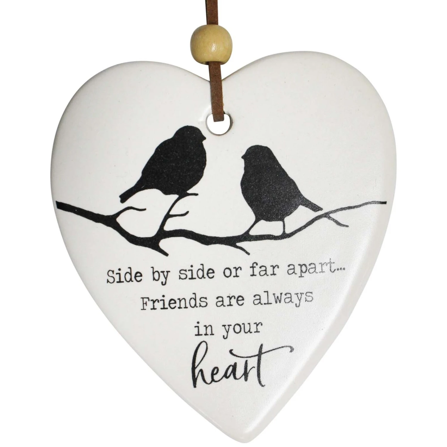 Introduce a touch of charm and warmth to any retail space with the Hanging Heart Birds Side By Side ornament. This delightful ceramic decoration features a heartfelt message, “Side by side or far apart… Friends are always in your heart,” embossed on a compact 8x9cm heart, complemented by a simple hanger for easy display. The classic black and white colour scheme makes this item a versatile addition to any decor collection, perfectly poised to captivate customers seeking meaningful and elegant gifts.