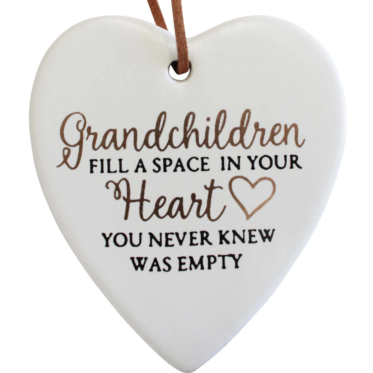 This ceramic heart ornament has a fun, eclectic look and a cosy aura. Hanging Heart Grandchildren is accentuated with cursive gold and a black handwritten inscription that says, “Grandchildren fills a space in your heart you never knew was empty.” The heartfelt message maximizes the awesomeness of grandparents and grandchildren. Although grandparents had lived through parenthood, with their grandkids, it is like a pot full of gold that needs to be treasured.