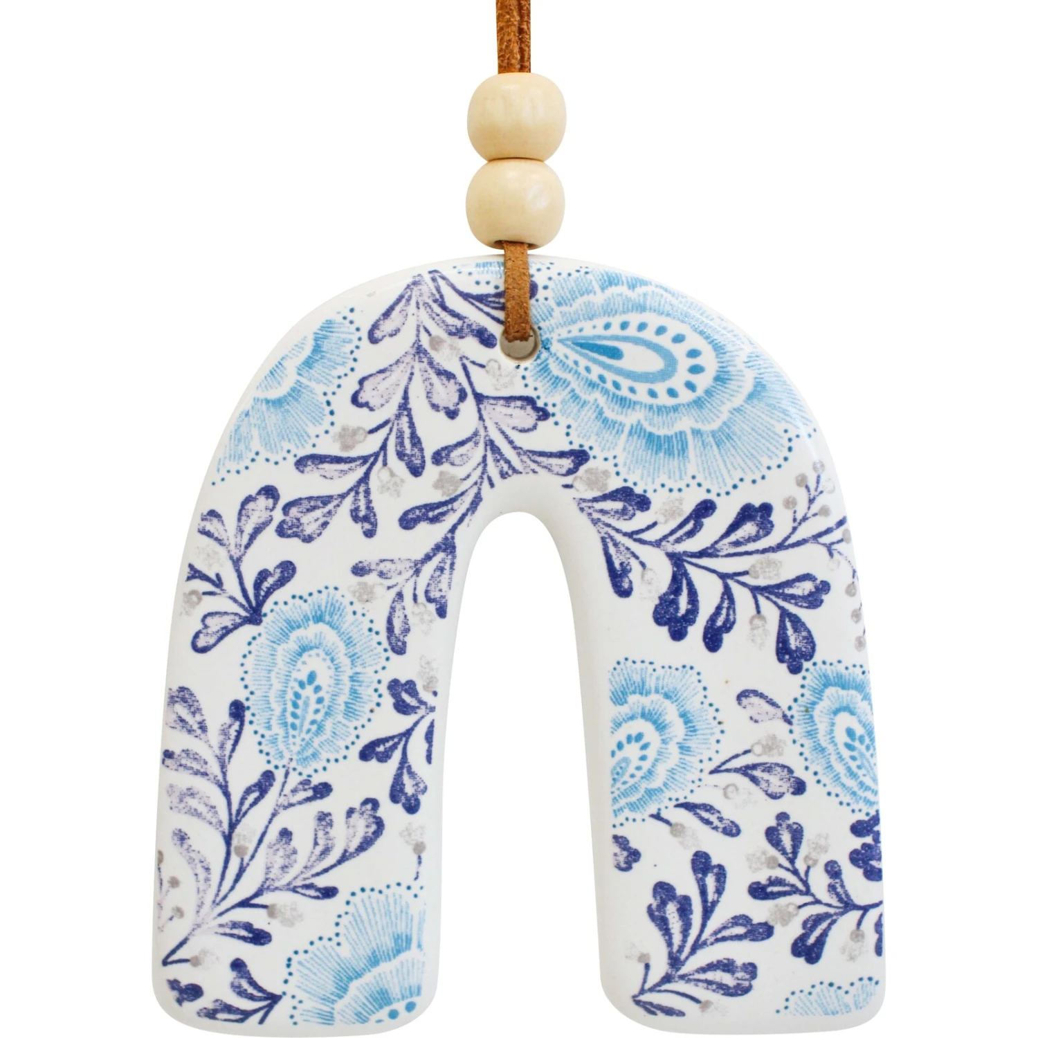 A whimsical burst of colour and charm, designed to add a touch of magic to any space. Crafted in the shape of a vibrant rainbow, this ornament boasts a delicate lacy blue pattern that evokes a sense of whimsy and wonder.