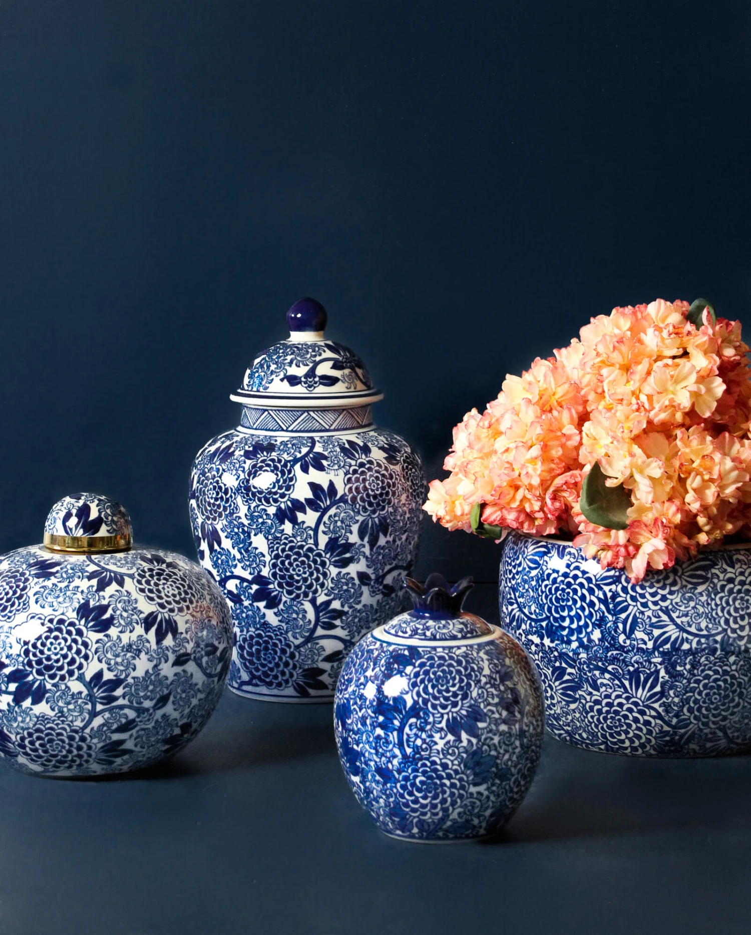 The jar chrysanthemum is a picture of perfection whether in terms of its exquisite design that adorns its entire exterior-right to the little blue painted crown that makes up its lid-a great means to give your table tops that colour boost and also while at it, provide a storage option for keeping knick knacks. The oriental white and blue colour combination never fails to hit target.