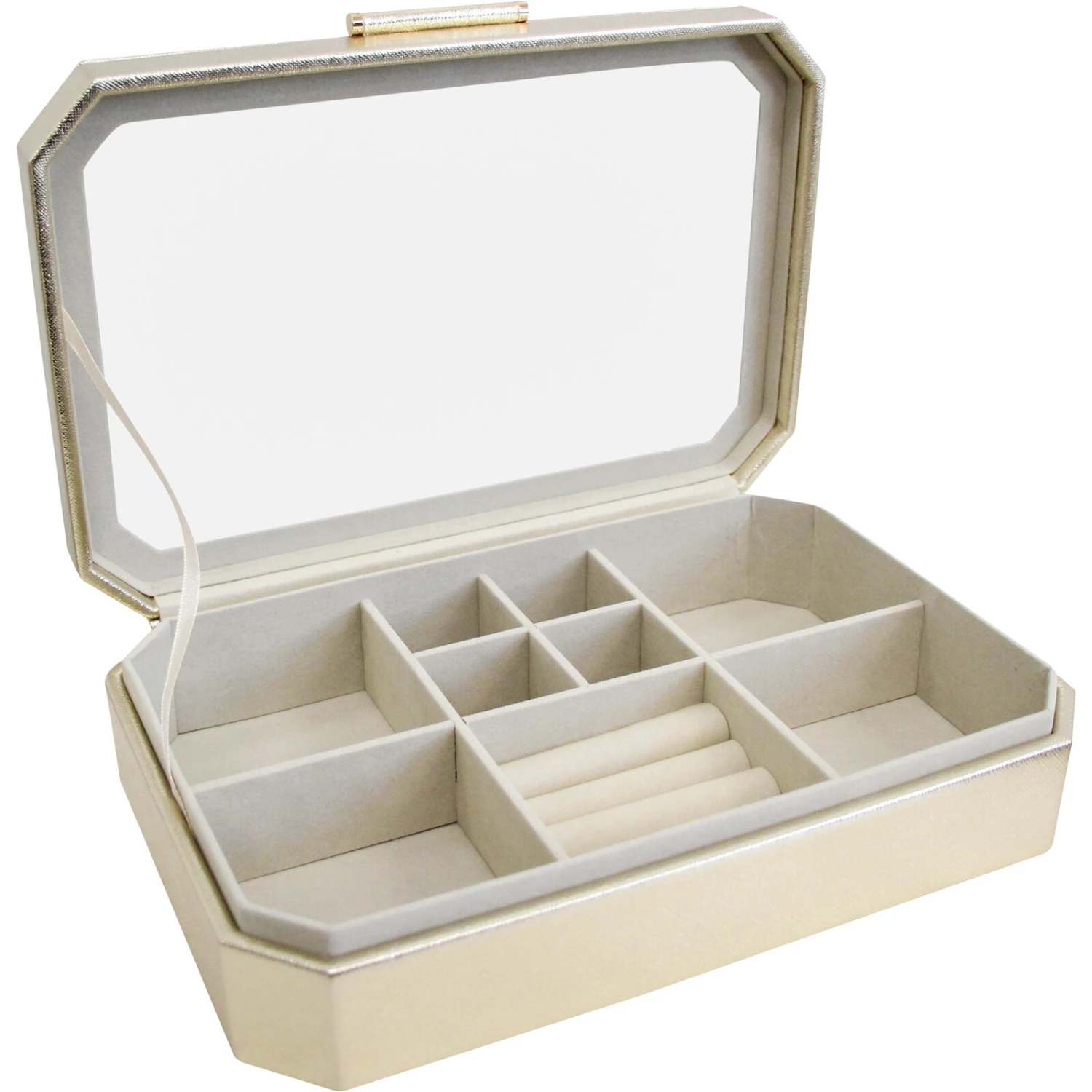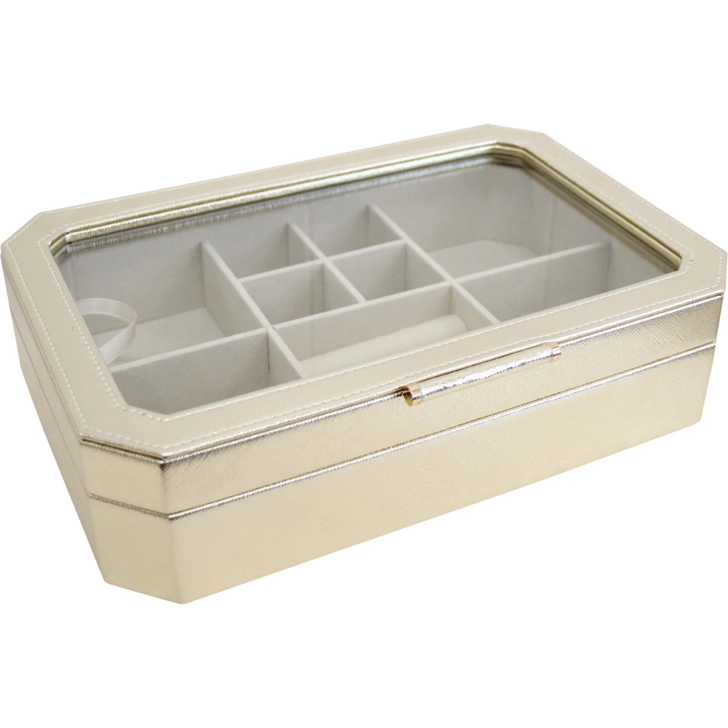 Elevate your collection with the Jewellery Box Lrg Champagne, an epitome of elegance and organization. Crafted from quality MDF and lined with luxurious polyester, this box features a durable PU exterior and a clear glass lid, making it a lovely display piece that allows for easy viewing of contents. Measuring 27.5×17.5×6.5cm, this sophisticated champagne-hued organizer is an attractive option for customers seeking a stylish solution for safeguarding their precious jewels.