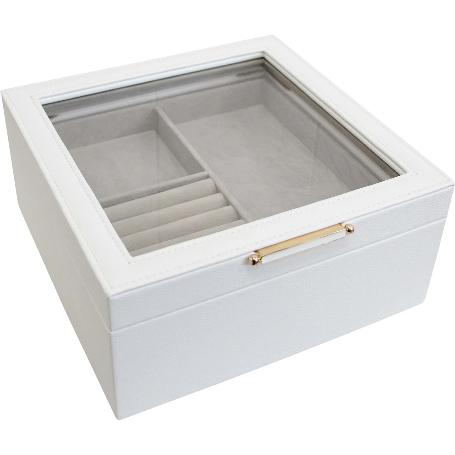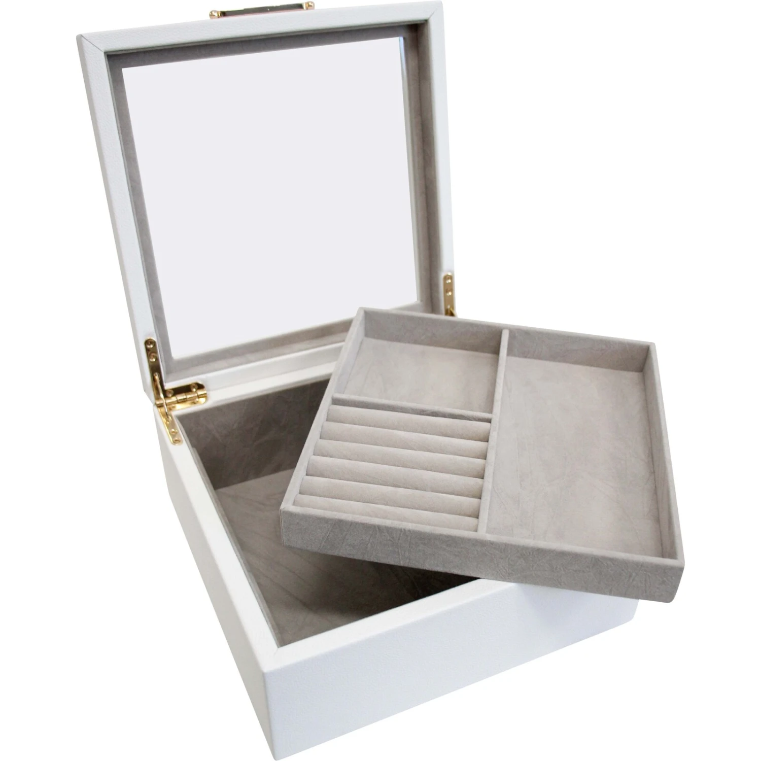 Elevate your boutique’s display offerings with the Jewellery Box Sq White, a sophisticated accessory storage solution measuring 21×20.5x10cm. Crafted from durable MDF and adorned with a chic polyester and PU interior, this box features a glass lid that allows for an enticing view of the treasures inside. Its pristine white hue and modern design are sure to attract customers looking for an elegant way to organize and showcase their jewelry.