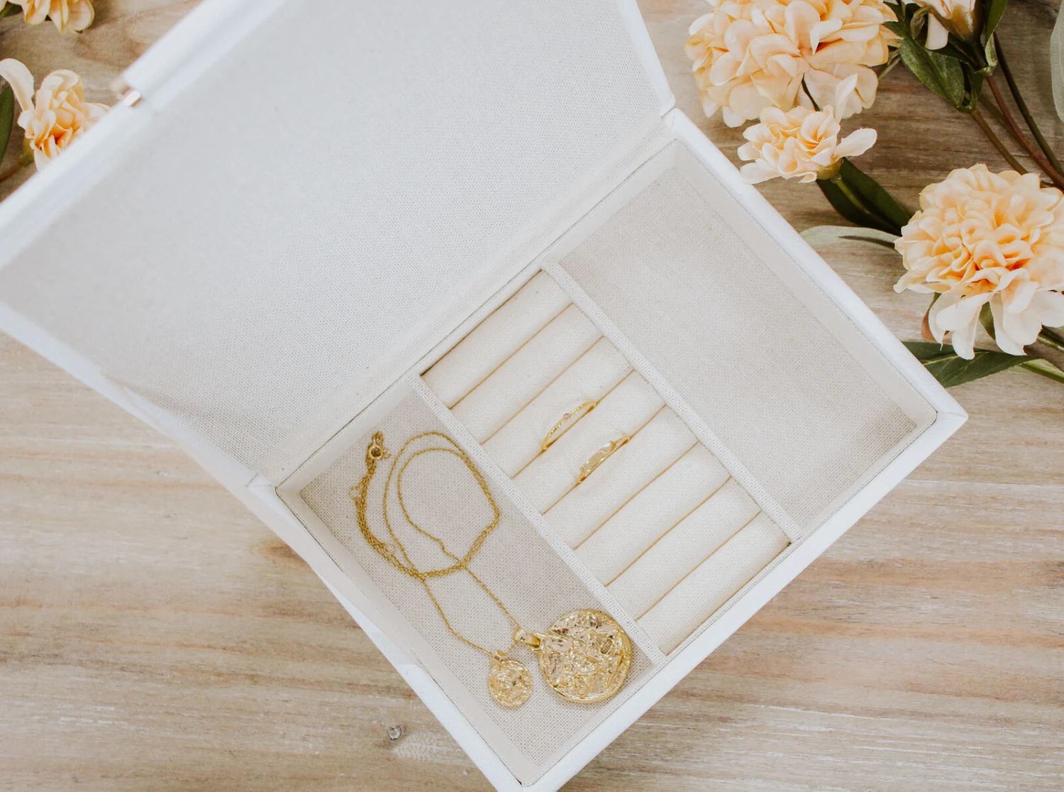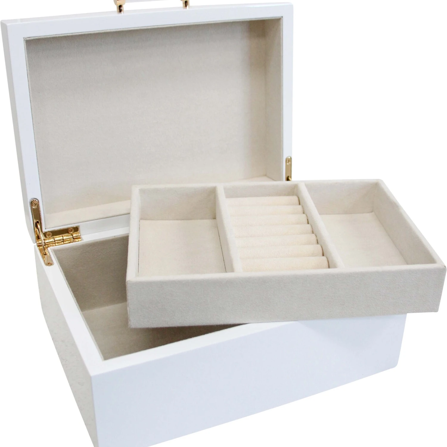 Add a touch of elegance to your jewelry organization with the Lacquer Jewellery Box Med White. This sophisticated medium-sized box measures 19.5×14.5×9.5 cm, offering a compact yet ample space for your adornments. Crafted from sturdy MDF with a glossy enamel lacquer finish and accented with glass and polyester detailing, it not only stores but also showcases your treasured pieces with style. Its classic design and neutral white hue make it a versatile addition to any retail collection, appealing to customers seeking a blend of functionality and chic aesthetic.