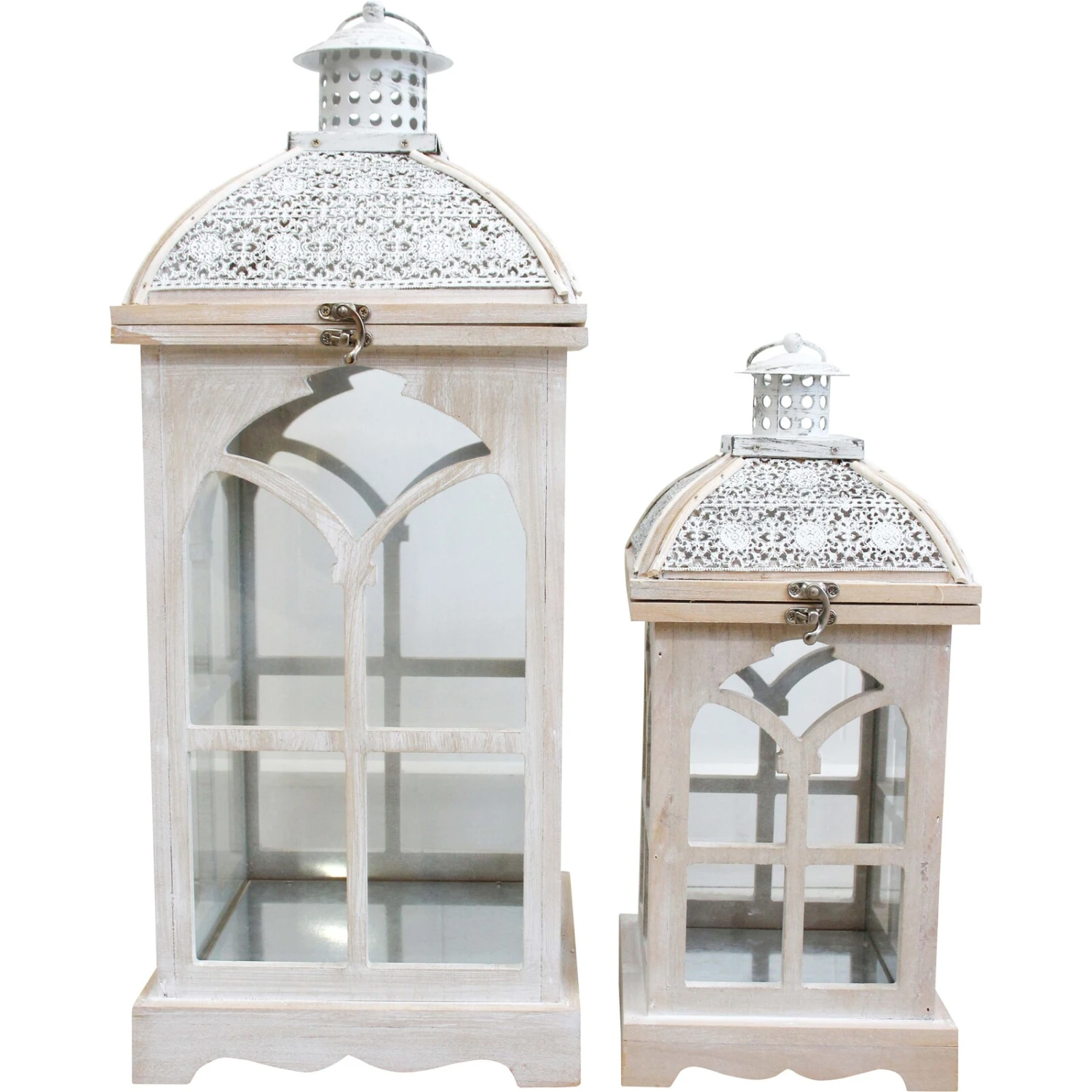 Elevate any setting with the Lanterns S/2 Arabesque, which combines the timeless charm of traditional design with modern materials. The larger lantern measures 24x24x59cm and the smaller companion stands at 18x18x40cm plus the handle, both crafted from a blend of MDF, glass, and metal with a serene white finish that exudes elegance. These versatile lanterns can act as a captivating centerpiece or an ambient light source, promising to lure in customers seeking a touch of sophistication for their homes or events.