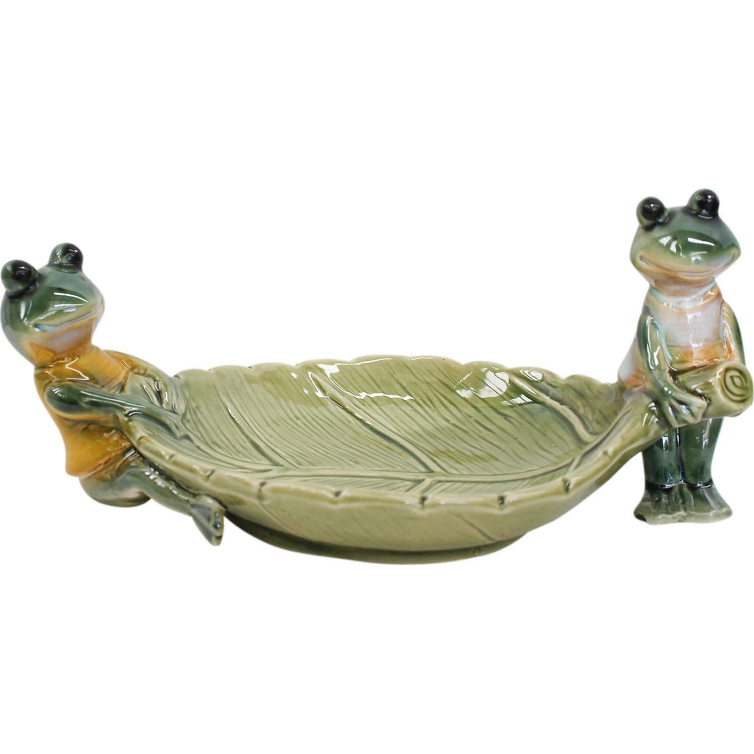 Stylish and dignified, the Leaf Plate w/ Frogs is a pretty ceramic decorative ornament that is capable of transforming and brightening the decorative ambiance of both living and working spaces. The ornament features a leaf shaped ceramic mould and two frogs. The first frog holds the end point of the leaf while the second frog is more playful than the first and therefore rests comfortably on the other end of the ceramic leaf.