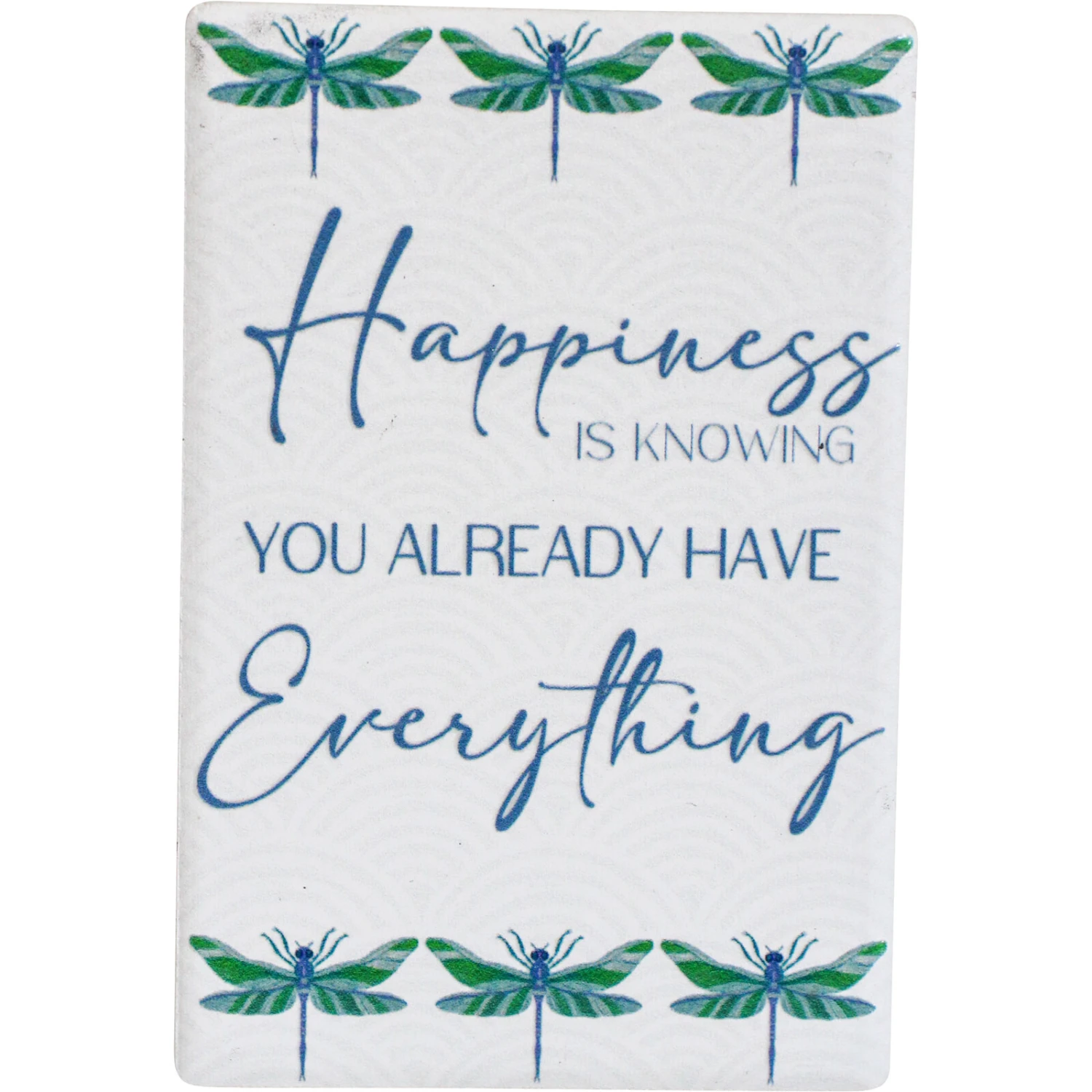 Our Magnet Happiness is a unique and powerful image that beautifully conveys the essence of genuine joy. Featuring three enchanting dragonfly motifs, two at the top and one at the bottom, and a compelling central text that declares, “Happiness is knowing you already have everything.”