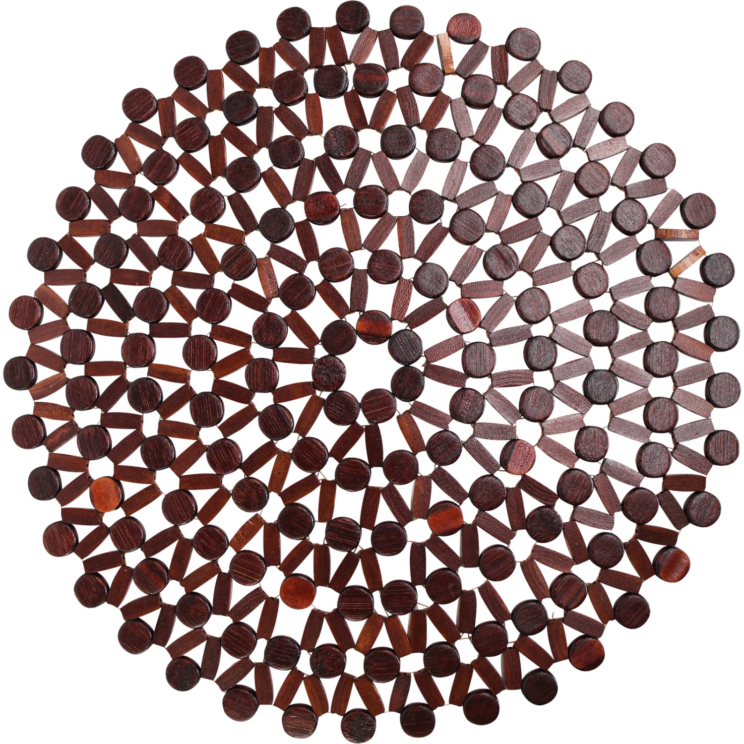 The pattern is gorgeously created from bits of shaped bamboo-coloured in deep reddish tobacco coloured shade-each piece finely interlinked, flexible because of the usage of wire that keeps all of those bits together-makes this a unique organic in feel and look placemat. Crafted by hand, this artisanal quality product has been crafted using traditional methods using sustainable material that will add grace and elegance to your table setting.