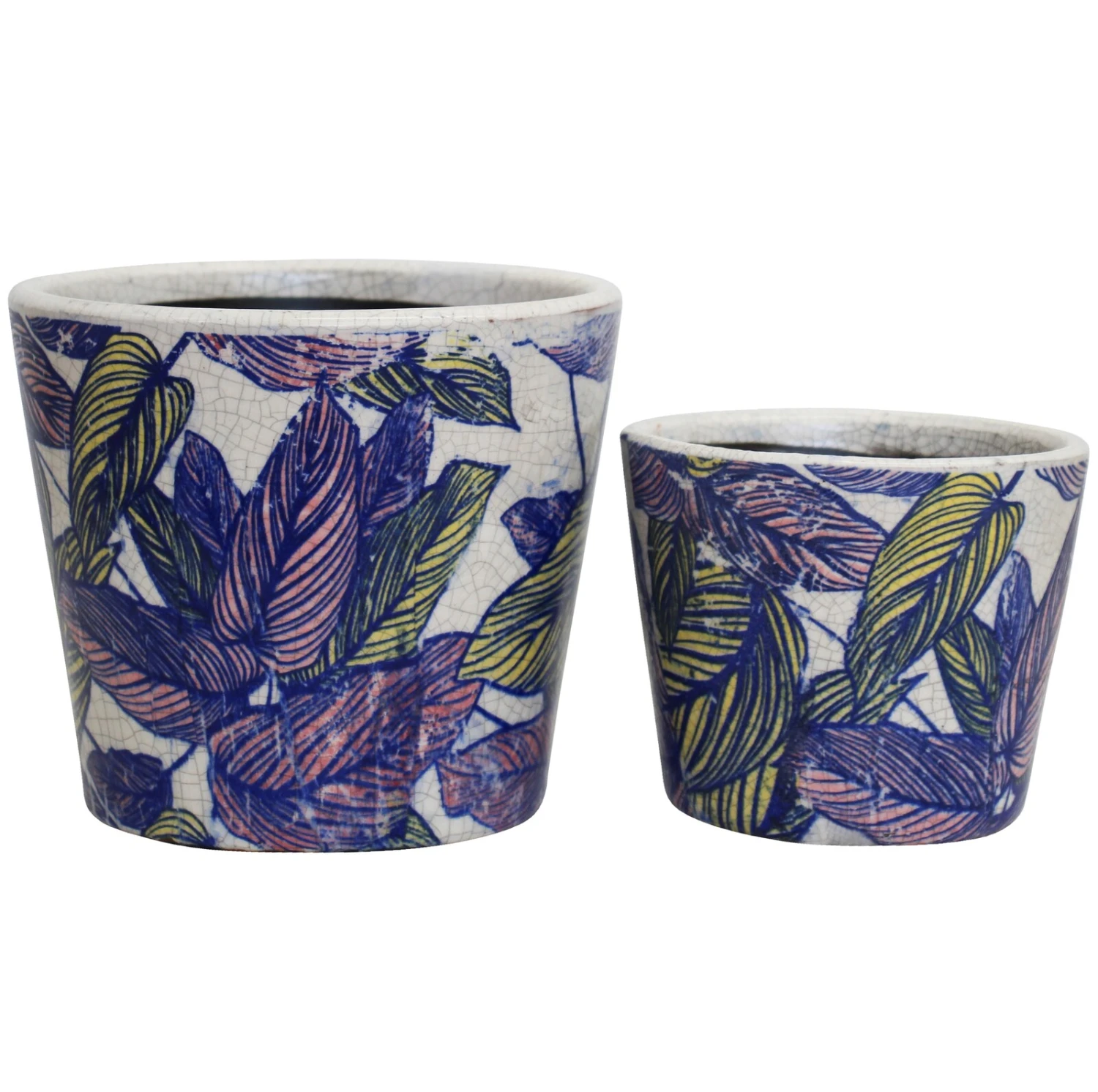 The two pots presented in this Pot S/2 Flora set showcases such alluring decorative beauty which is a product of the artful glazing, cylindrical shapeliness, material durability and the practically functional properties which this planter pots possess. The two pots are made of the same terracotta material, in the same shape, feature the same floral themed painting, but differ from one another in their size.