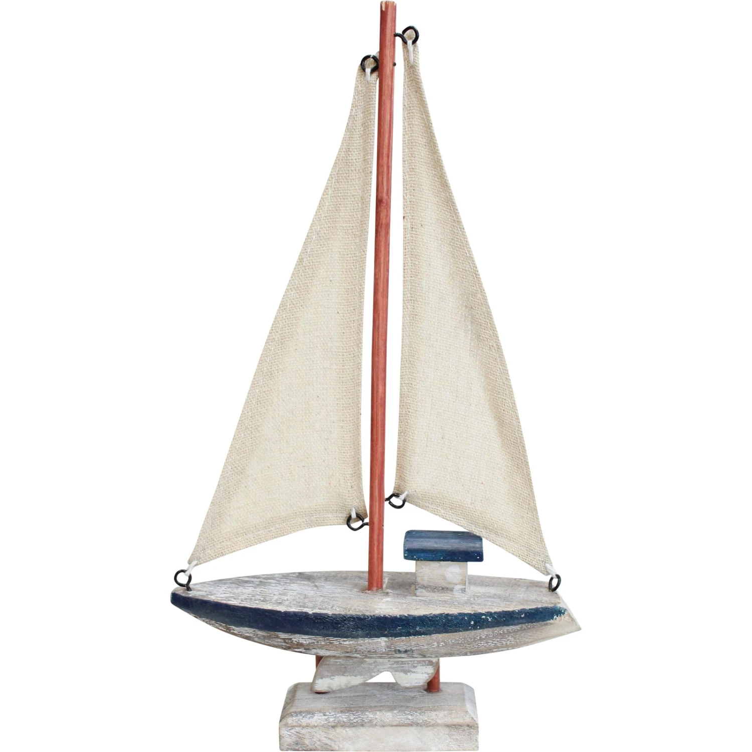Right from the wood coloured mast to the white of the boat- the broad stripe along the edge on top in blue- to the manner in which the sails have been attached to the mast- everything about this 27 cm high sailboat, makes it interesting and intriguing. Bring to your nautical theme, the fun and adventure of a real replica crafted from MDF.