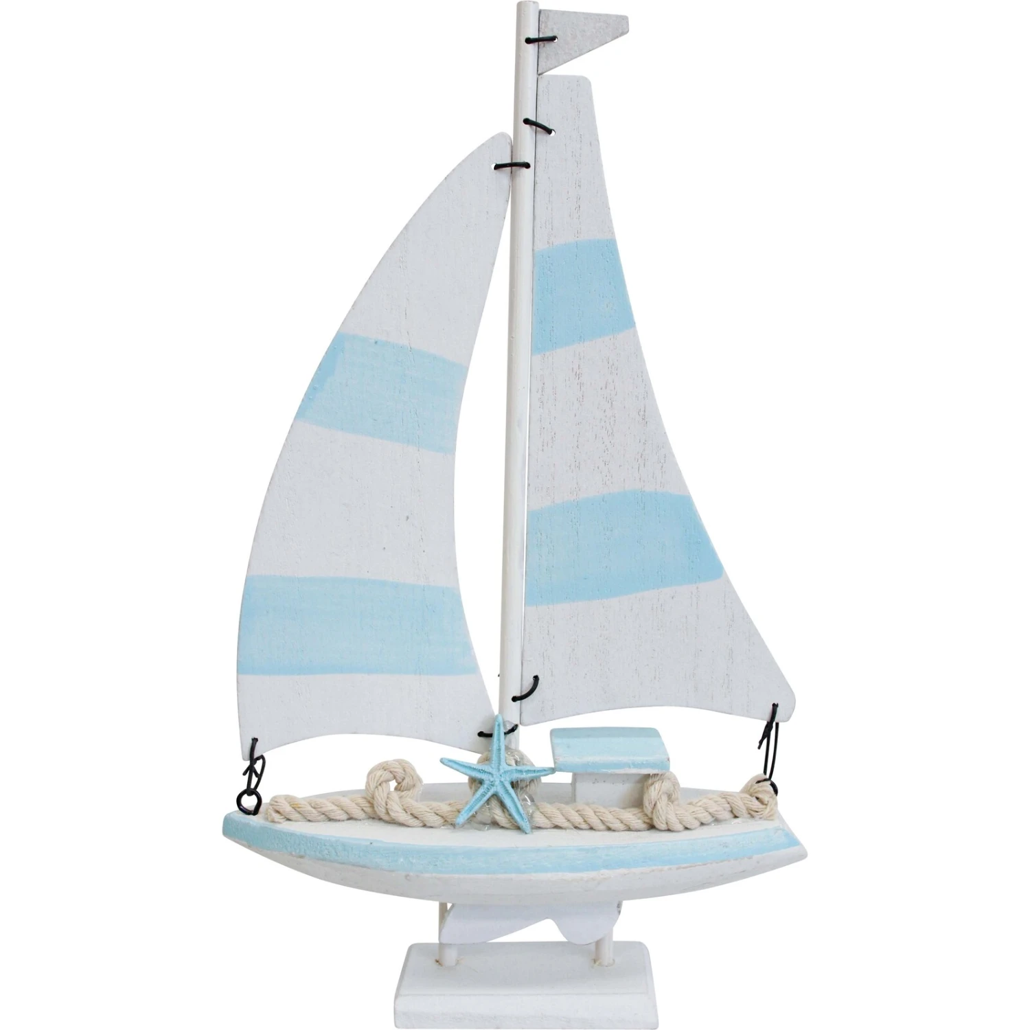 Bring a delightful nautical flair into your spaces with this handcrafted sailboat crafted from wood look MDF. The detailing of the sails in light blue and white as well as the shape of the dugout boat replicates a real sailboat to great perfection. Will make an impressive statement on a shelf or a table top inviting a fresh new seaside Vibe.