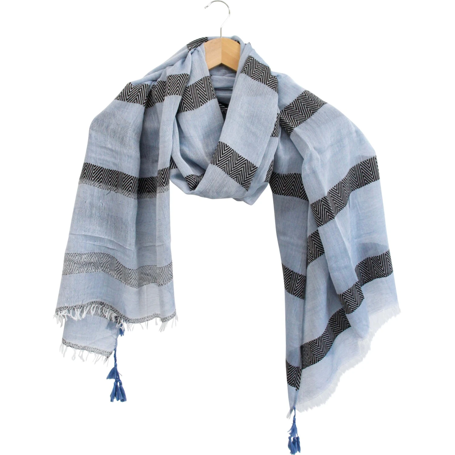 Elevate your accessory collection with the Scarf/Sarong Sunset, an exquisite dual-purpose piece that can be styled as a chic scarf or worn as a breezy sarong. Measuring approximately 90x180cm and crafted from soft, durable polyester, it boasts a serene blue-grey palette enhanced by contrasting black geometric patterns for a contemporary edge. An ideal offering for retailers, this versatile accessory caters to fashion-forward customers seeking style and functionality.