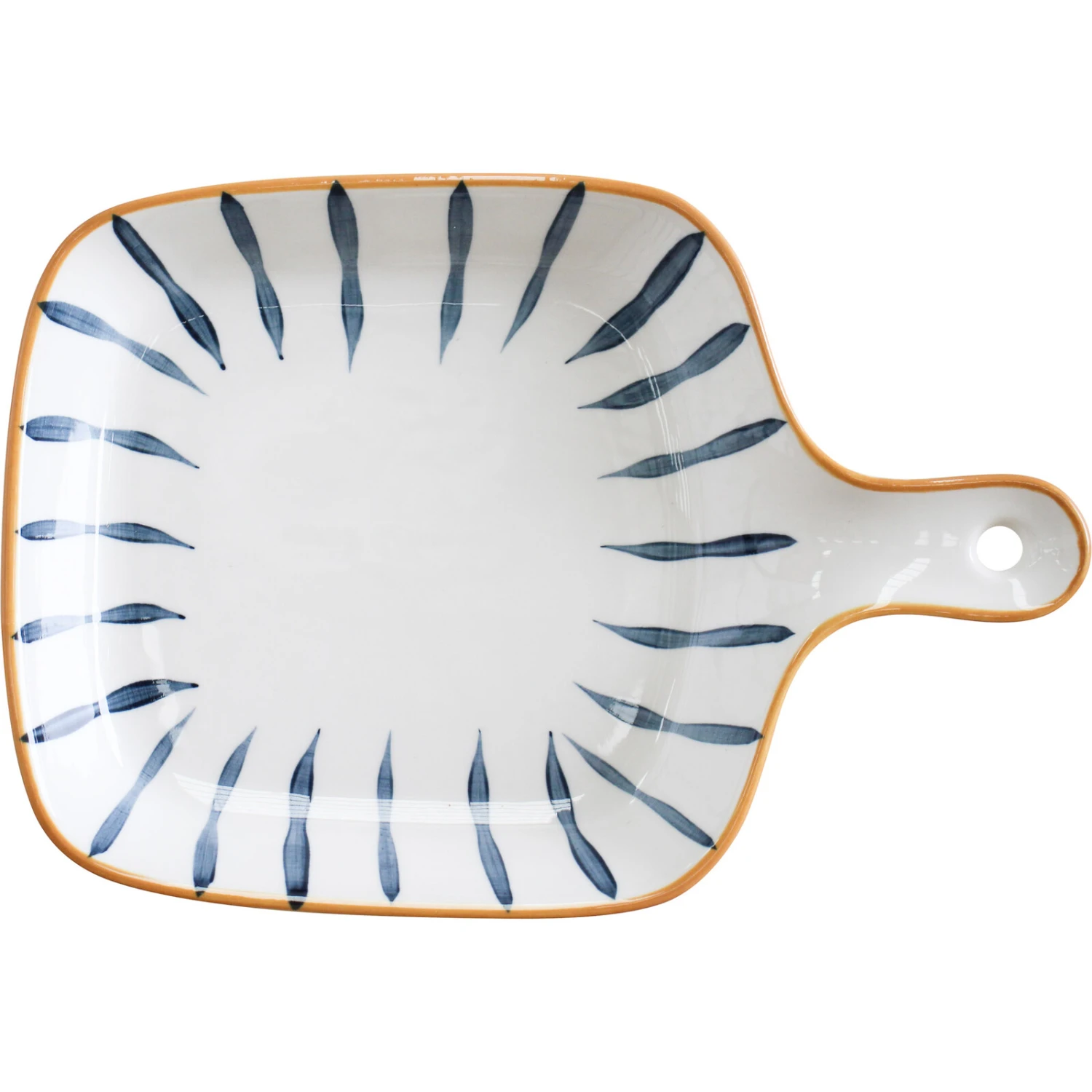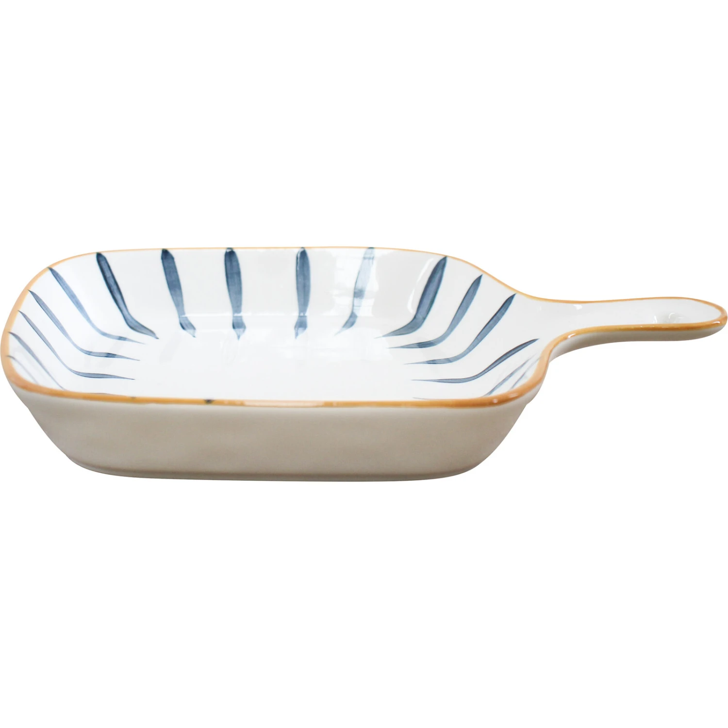 Unlike simply handing over a bowl to a guest, this rectangular-shaped ceramic platter is perfect for displaying and serving appetizers or snacks from which guests can pick. It has slightly raised edges, shallow depth, and a gold rim that accentuates its deluxe vibe, making food appear appealing and appetizing.