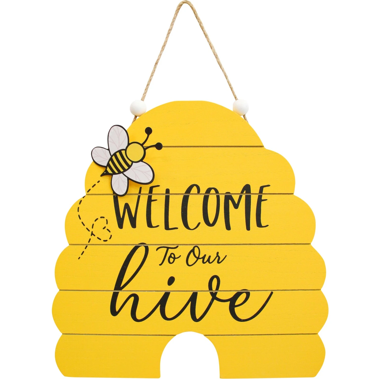 Welcome your guests with a touch of charm using the Sign Bee Hive, a 30×2.5×30.5 cm vibrant yellow decor piece crafted from MDF, metal, and jute. Its adorable bee motif and welcoming message make it a delightful addition to any entrance, sure to attract customers seeking cheerful home accents. Retailers will find this eye-catching sign an excellent choice to drive sales and brighten up their product range.