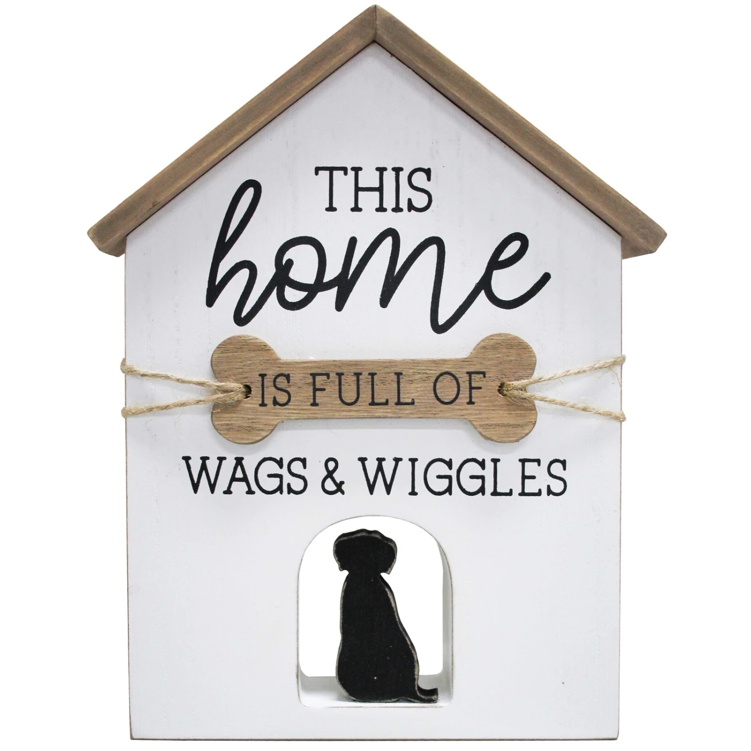 Add a touch of charm to any pet lover’s home with the ‘Sign Wags and Wiggles’, crafted from durable MDF and wood materials. Measuring [Dimensions Needed], this rustic house-shaped sign features a delightful quote and a cut-out silhouette of a dog, making it the perfect decoration for any canine-friendly household. Retailers will find this whimsical sign to be a popular choice among customers seeking to express their love for their four-legged friends in a stylish and heartwarming way.