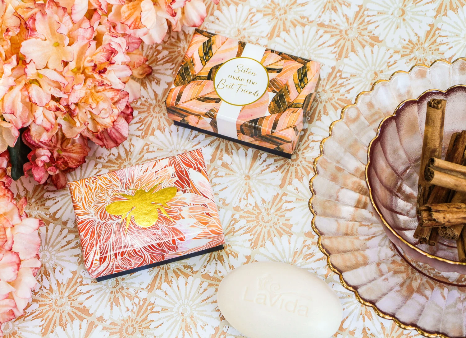 A wonderful piece that features a stunning bee motif in a bold gold hue on a beautiful floral background. Bees are guardians of the natural world. They are linked with love and romance. This beautiful box houses a natural and skin-friendly soap.