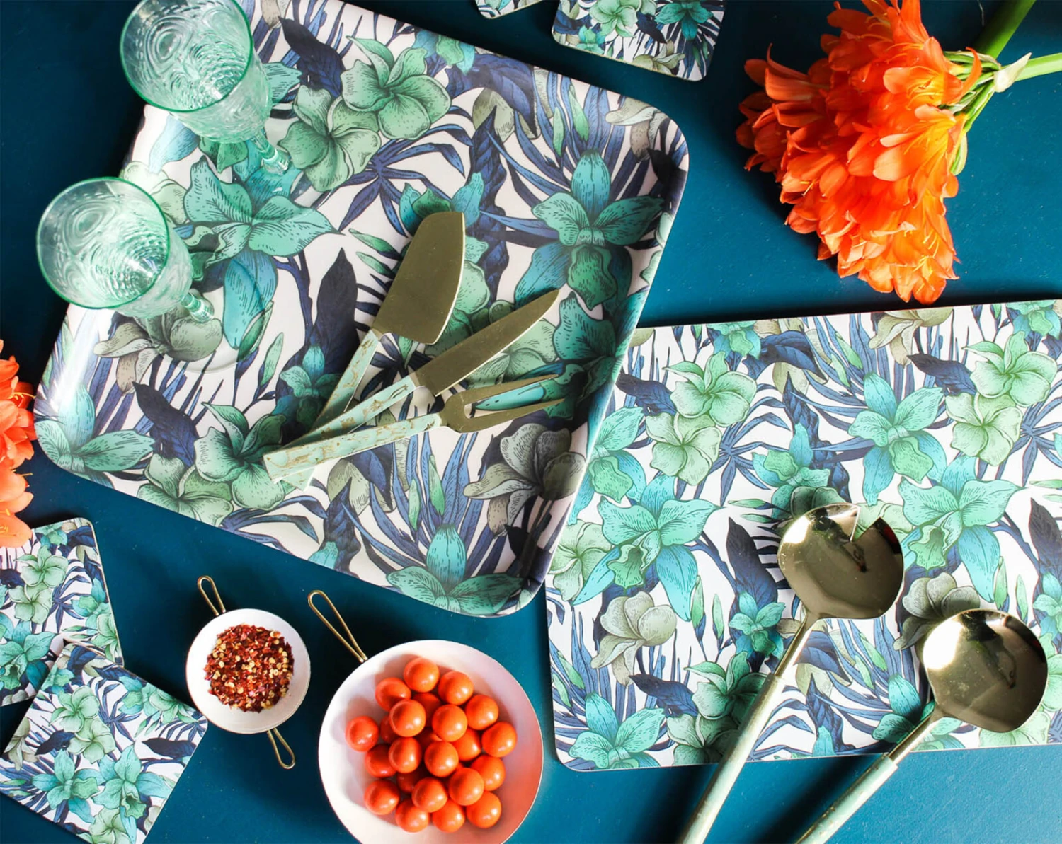 The tropical energy in the print instantly attracts your attention. Crafted from melamine and bamboo, traditional material giving it a lightweight yet solid structure, while the melamine in shows that the tray is easy to maintain and sturdy enough for regular usage. Whether you wish to carry glasses, bowls or plates- the 33 CM dimension square tray, will give you a space to carry such a payload, helping you handle it elegantly and most charmingly.