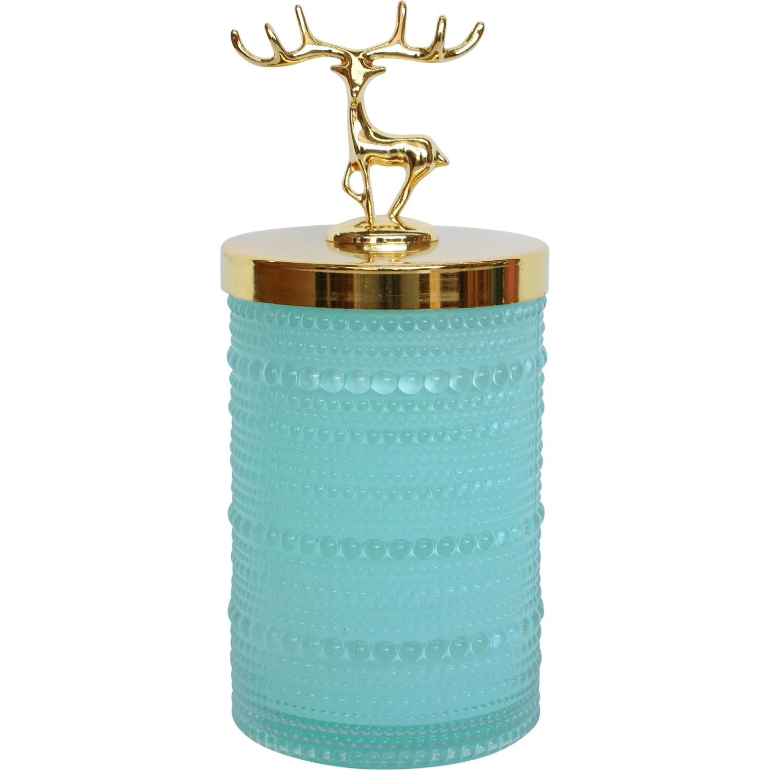 The soft blue reminds you of the temperate clear skies – of the onset of spring and the new hope that comes with a new season. Add to that the delightful beauty of a textured glass base topped with the gold of the lid showcasing the crowning glory of the design. The reindeer atop the lid of this trinket jar is the showstopper as much as the solid glass body. Give your trinkets a safe haven for resting them before next use and do away with the constantly worry of misplacing them.