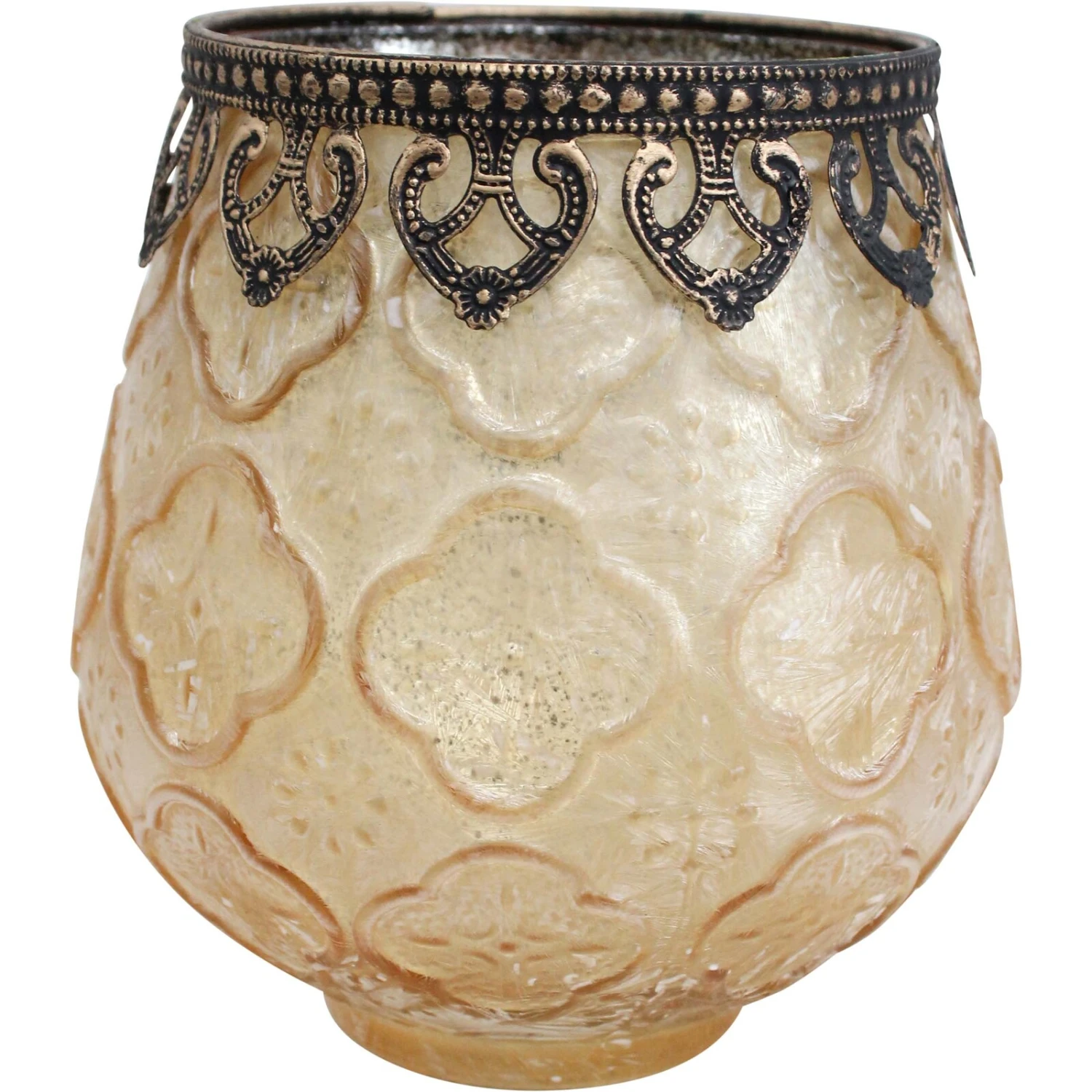 It sits prettily on its little round vase, the washed in white colour highlights the vintage pattern that adorns the exterior-the burnished colour of the rim made of metal adding just the kind of colour and material contrast that defines its beauty further-this is the kind of votive that spells class and elegance and is much suited for all kinds of homes and spaces. Candle illumination can make a definitive display and helps build in a relaxed and charming look for all kinds of spaces.