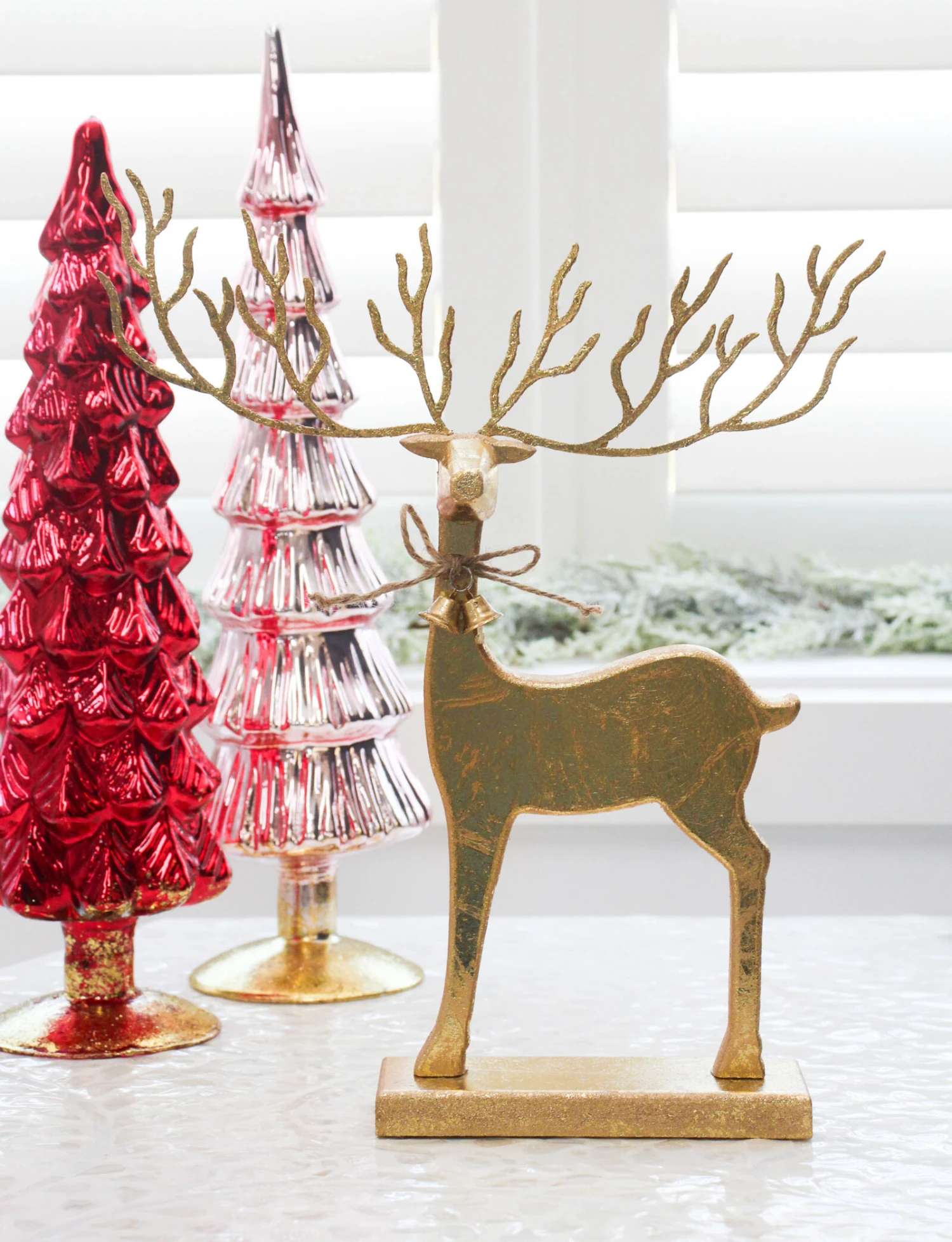Behold a vision of sheer elegance: a wooden reindeer transformed into a magnificent spectacle, adorned with a luxurious coat of shimmering gold. Poised upon a stand finished in resplendent gold, this regal creature emanates an irresistible allure, demanding admiration. Its antlers gracefully span out, embellished with radiant gold as the rest of the sculpture.