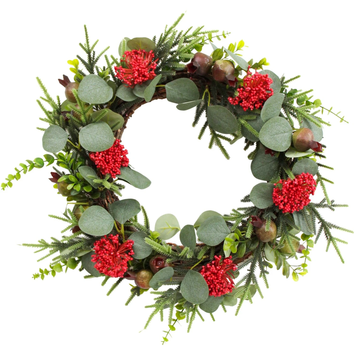 Capture the essence of elegance and durability with the Wreath Banksia Silvergum, measuring approximately 45x45x10 cm. This exquisite piece boasts a lush assembly of artificial greenery and vibrant red blooms, complemented by its robust construction of plastic and wire, ensuring lasting beauty with minimal maintenance. Its striking colour palette and lifelike appearance make it an alluring addition to any home or office decor, promising to enchant customers and enhance their shopping experience.